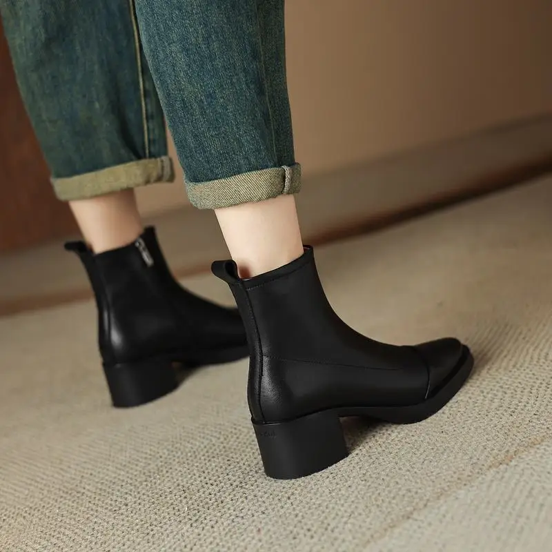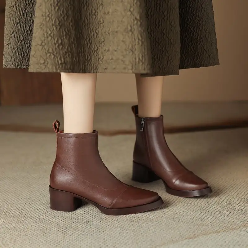Introducing our stunning Ankle Boots with Pointed Toe and Square Heels, crafted from premium genuine leather in both classic black and brown options. These boots are designed not only to elevate your style but also to provide unmatched comfort and durability. Whether you’re dressing up for a night out or adding a chic touch to your everyday wardrobe, these boots are the perfect choice.