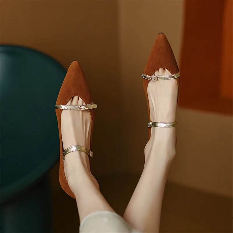 The brown heeled ballerinas with gold straps are the perfect blend of elegance and comfort, designed for the modern woman who values style without sacrificing ease. Crafted from premium lamb suede, these shoes add a touch of luxury and sophistication to any wardrobe. The chic gold straps bring a hint of glamour, while the low heel of 2.5 cm ensures optimal comfort for daily wear.