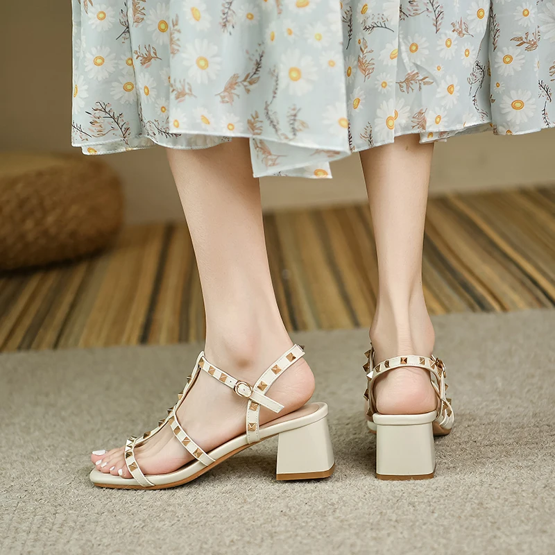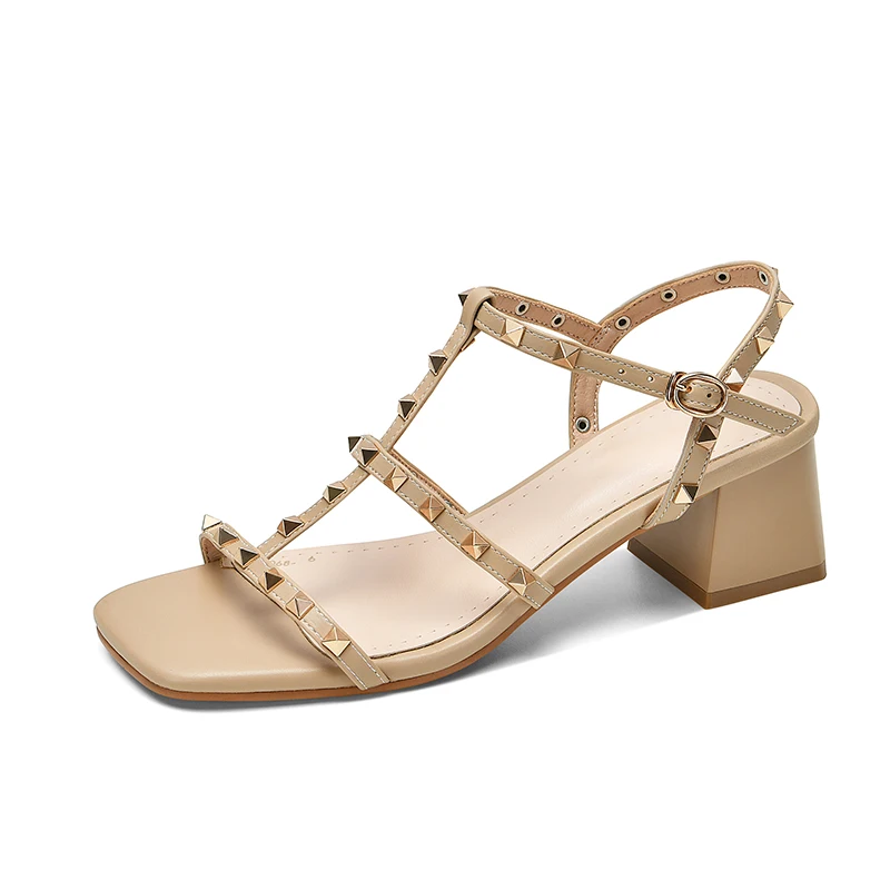 Beige open toe rivet sandals with buckle strap
