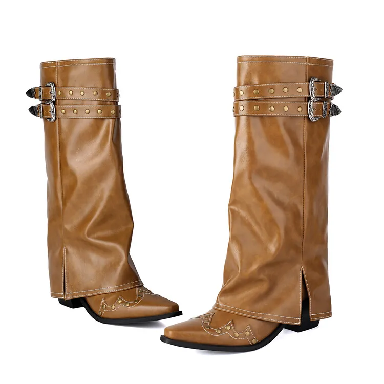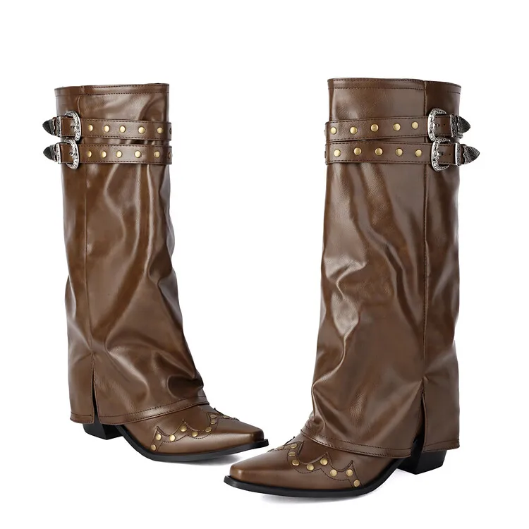 Big Size 48 Women Belt Buckles Knee High Boots Cowboy Overlay Long Booties Ladies Western Style Chunky Heels Pants Shoes