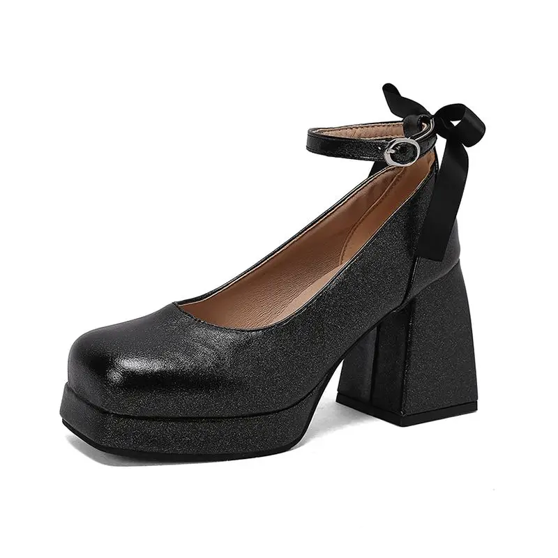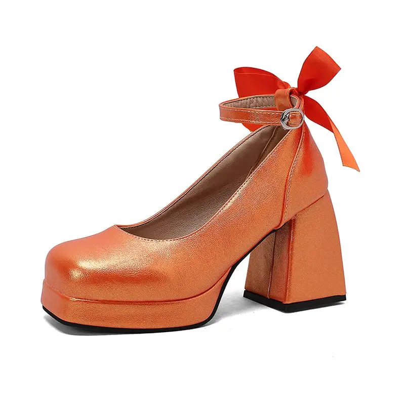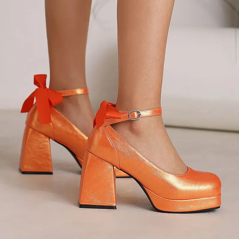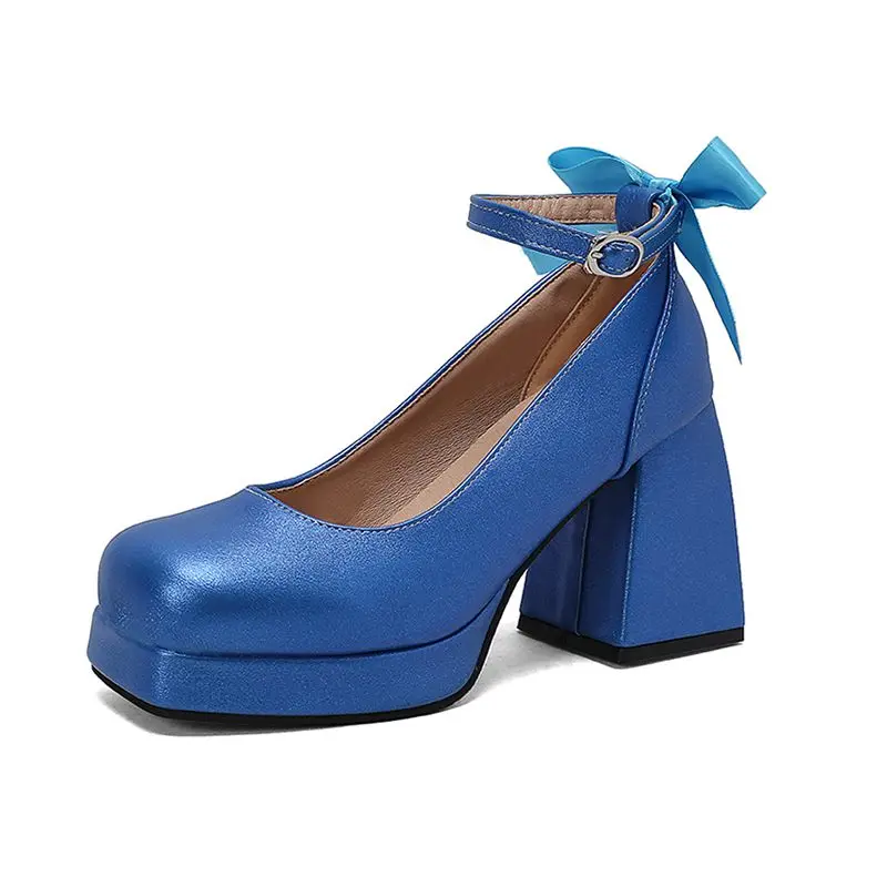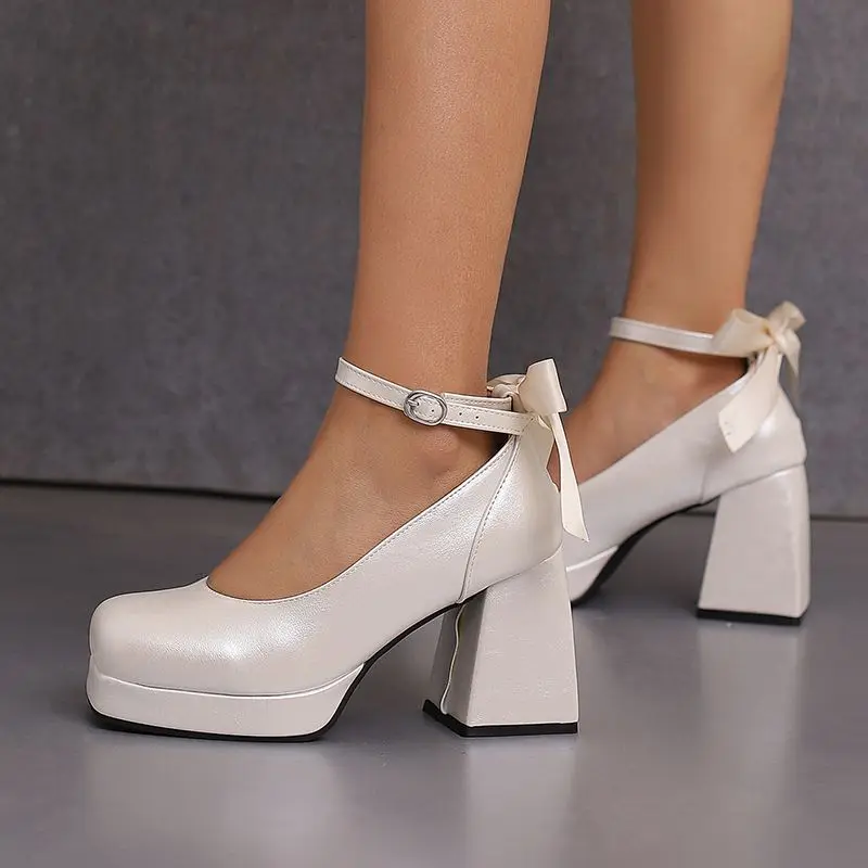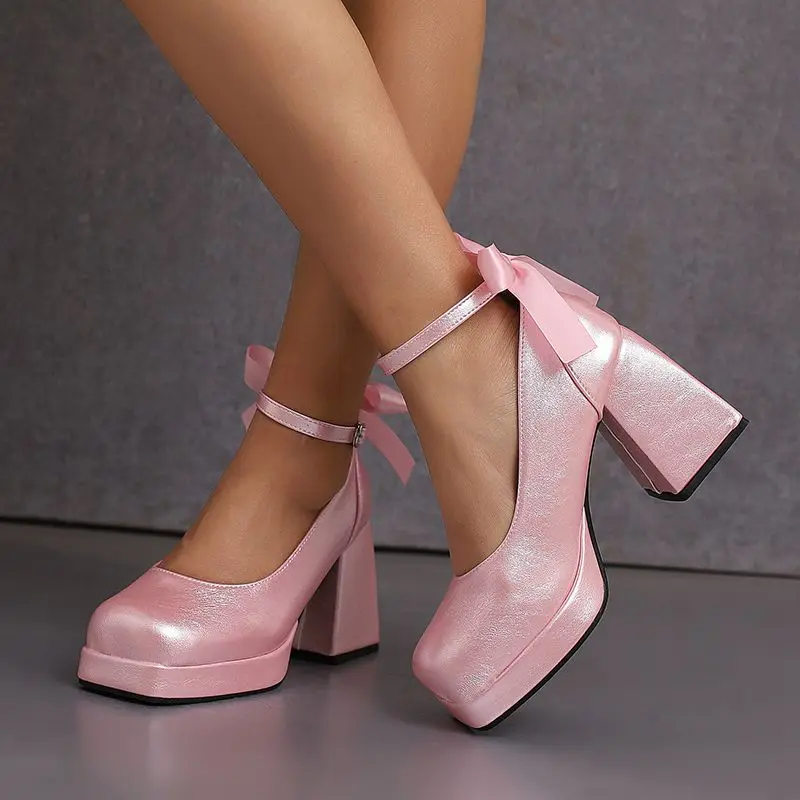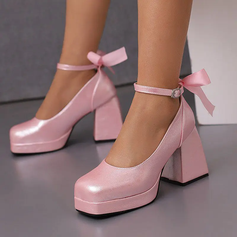 Block heel ankle strap platform pumps with bowknot