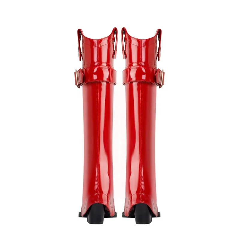 Cow Boy Western Styles Women Red Patent Knee High Boots 7.5cm Chunky Heels Overlay Booties Buckles Pants Shoes