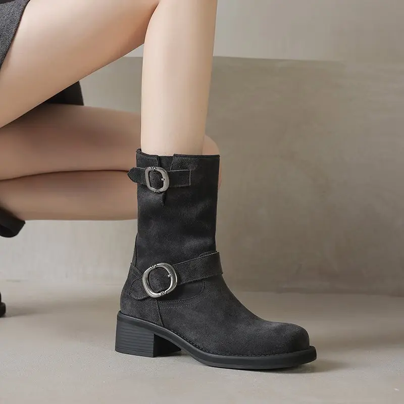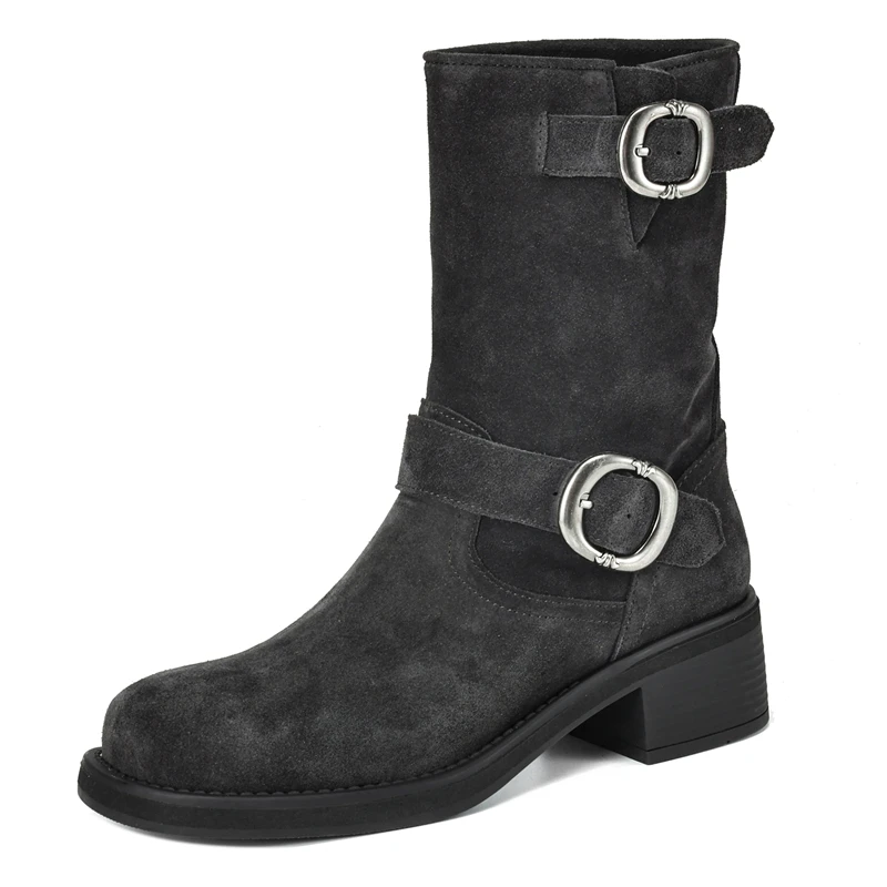 Discover the perfect blend of style and comfort with our Cow Suede Leather Ankle Boots with Buckle. These boots are designed for the modern individual seeking a touch of retro charm and practicality. Crafted from high-quality cow suede, they provide a luxurious feel while ensuring durability. The elegant buckle strap not only enhances the aesthetic but also offers a secure fit for all-day wear.