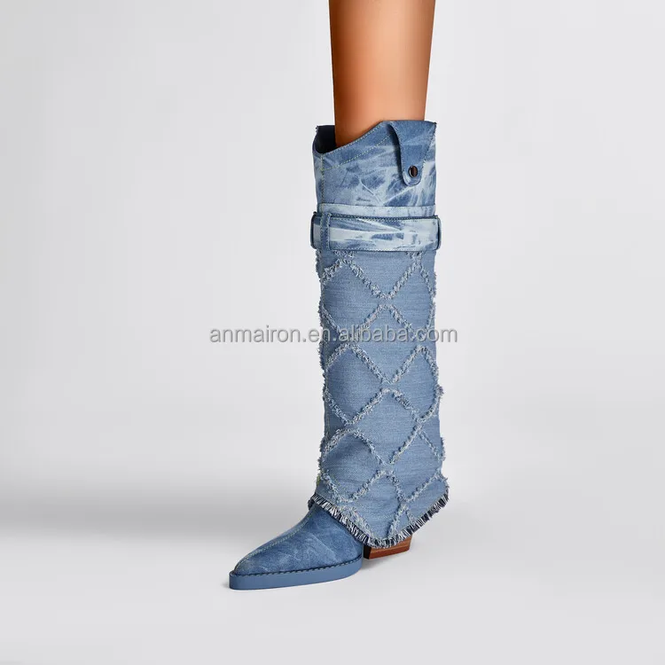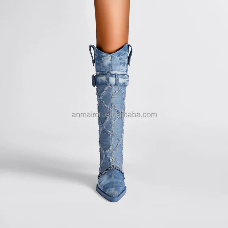 Custom Logo Cowboy Winter Boots Western Women Knee High Shoes 2023 New Fashion Denim Fleece Chunky Heel Slip on Pointed Toe