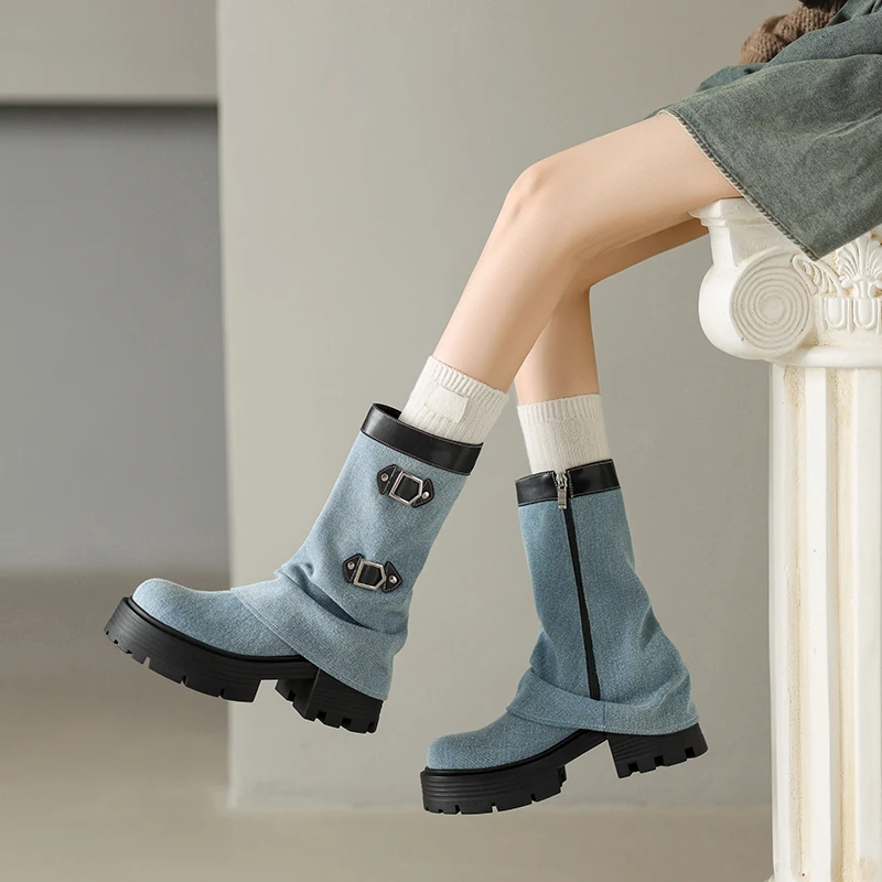 Discover the Stylish Denim Pleated Mid Calf Zipper Platform Boots