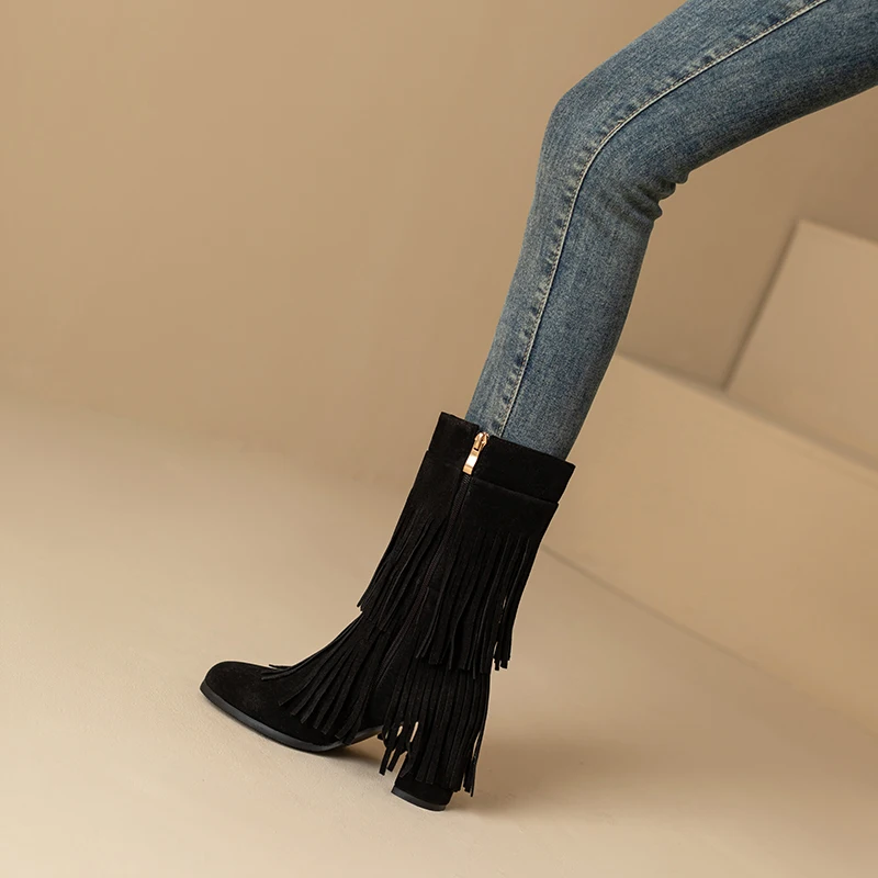Fringe zipper flock winter boots with thick heels