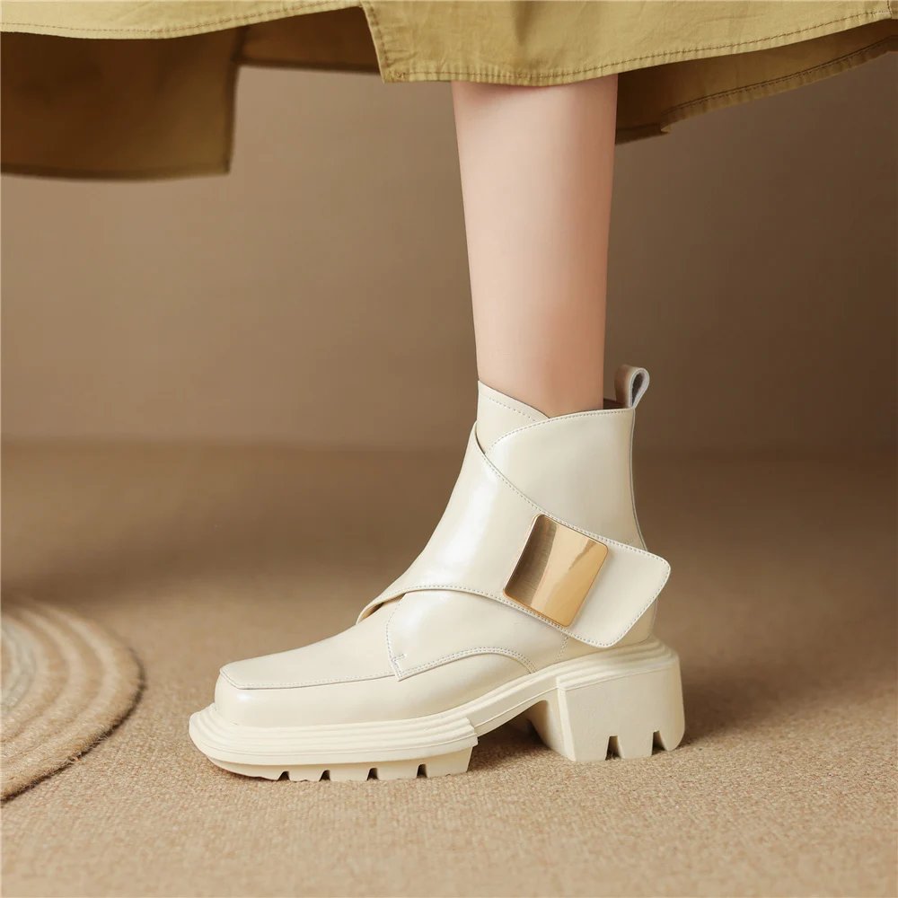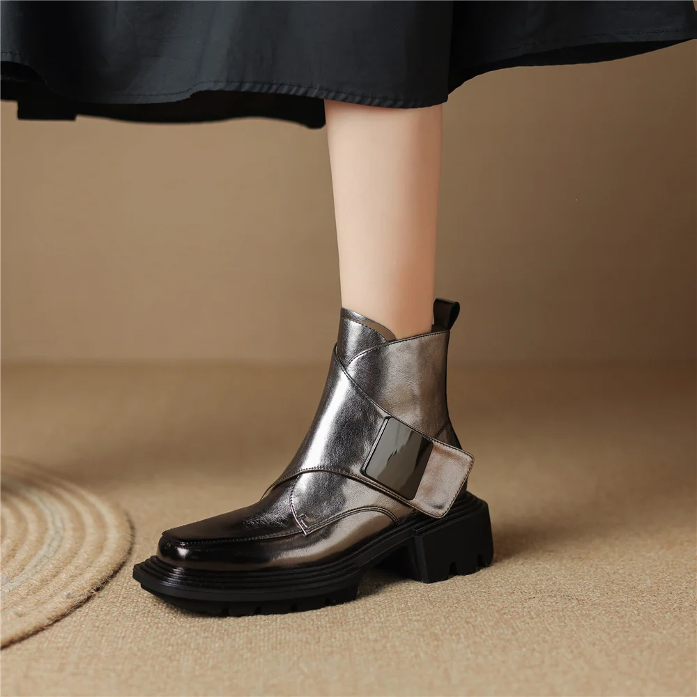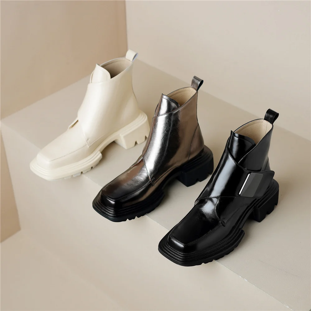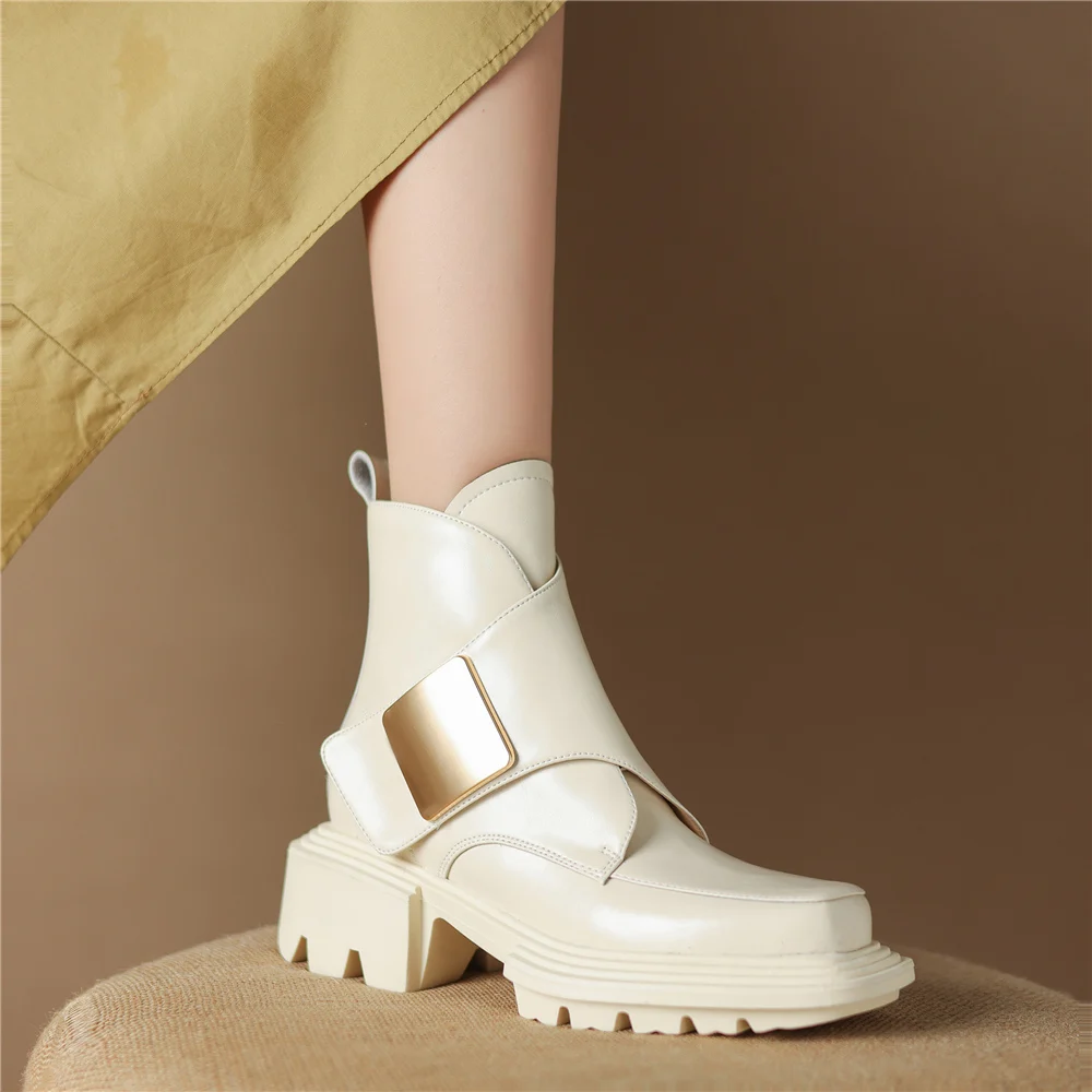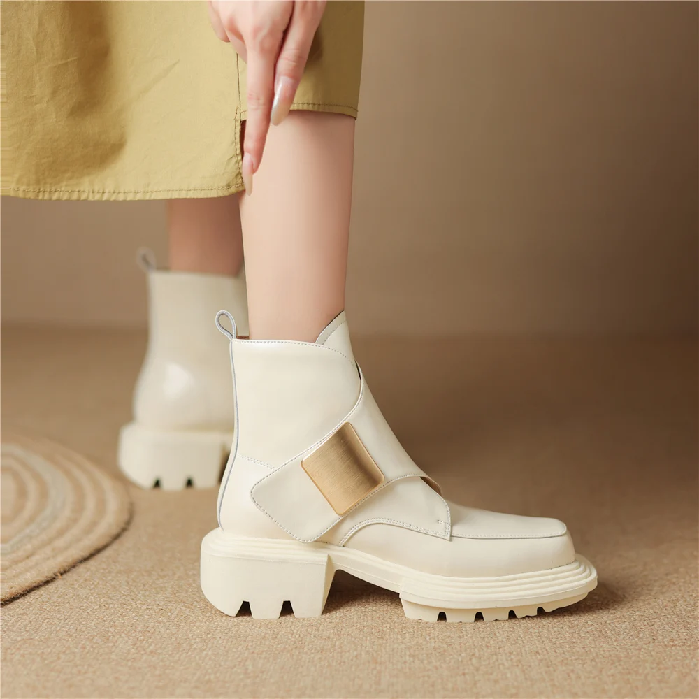 Genuine Leather Ankle Boots with Metal Decoration and Thick Heels