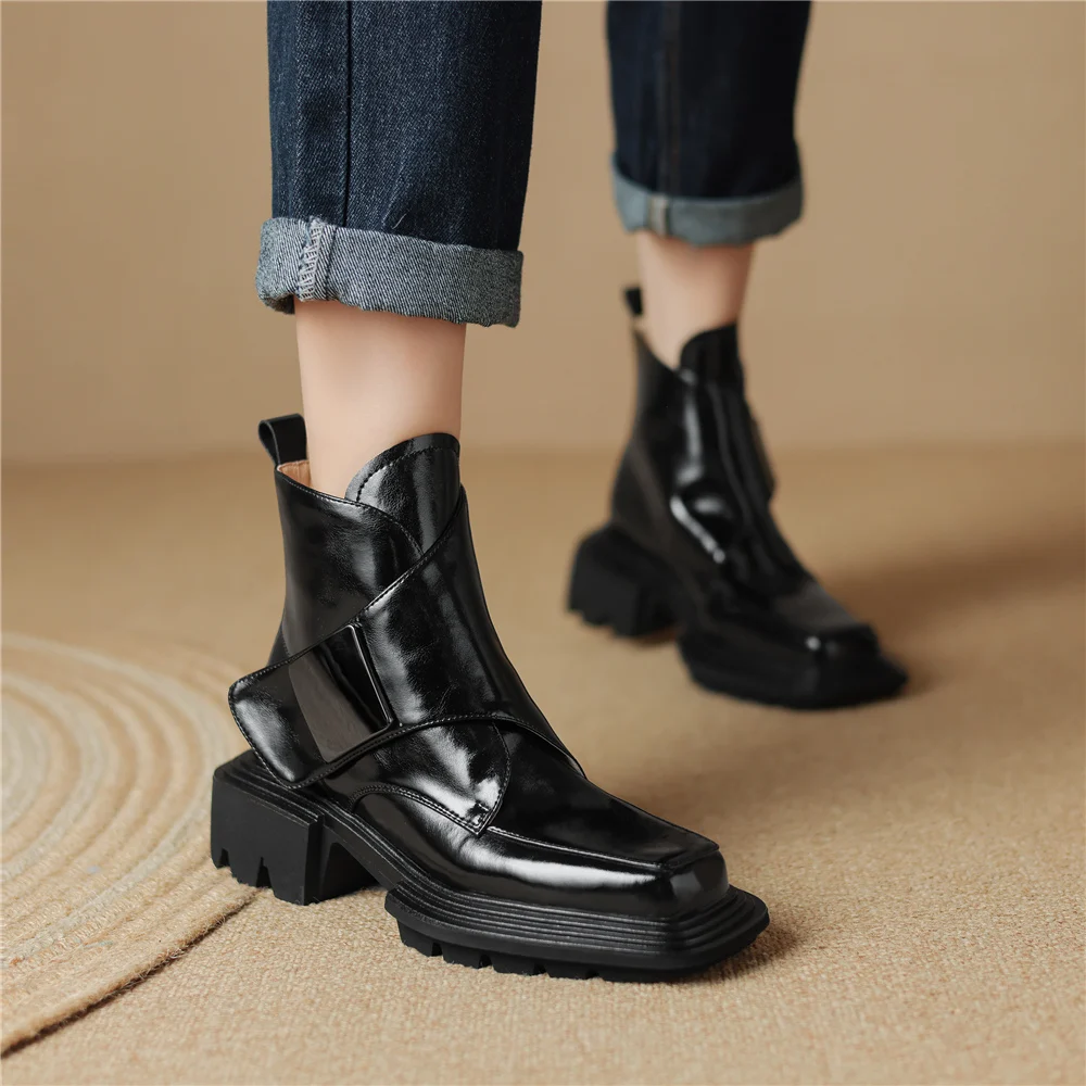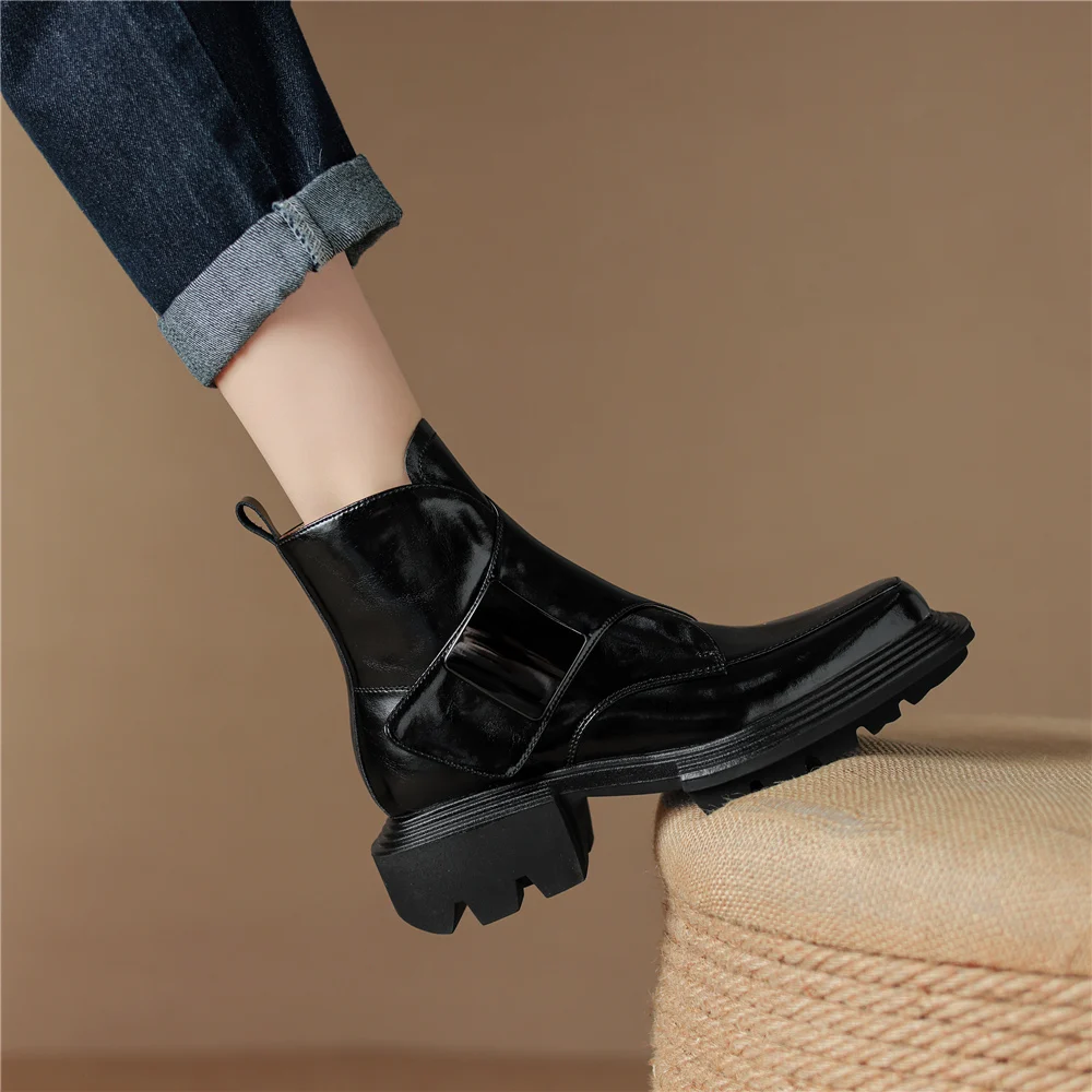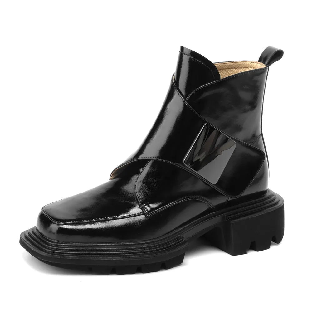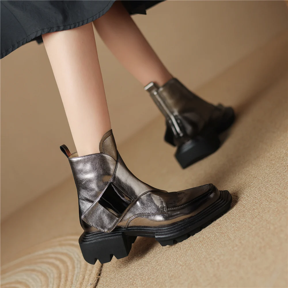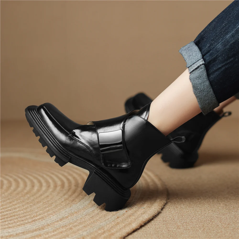 Genuine Leather Ankle Boots with Metal Decoration and Thick Heels