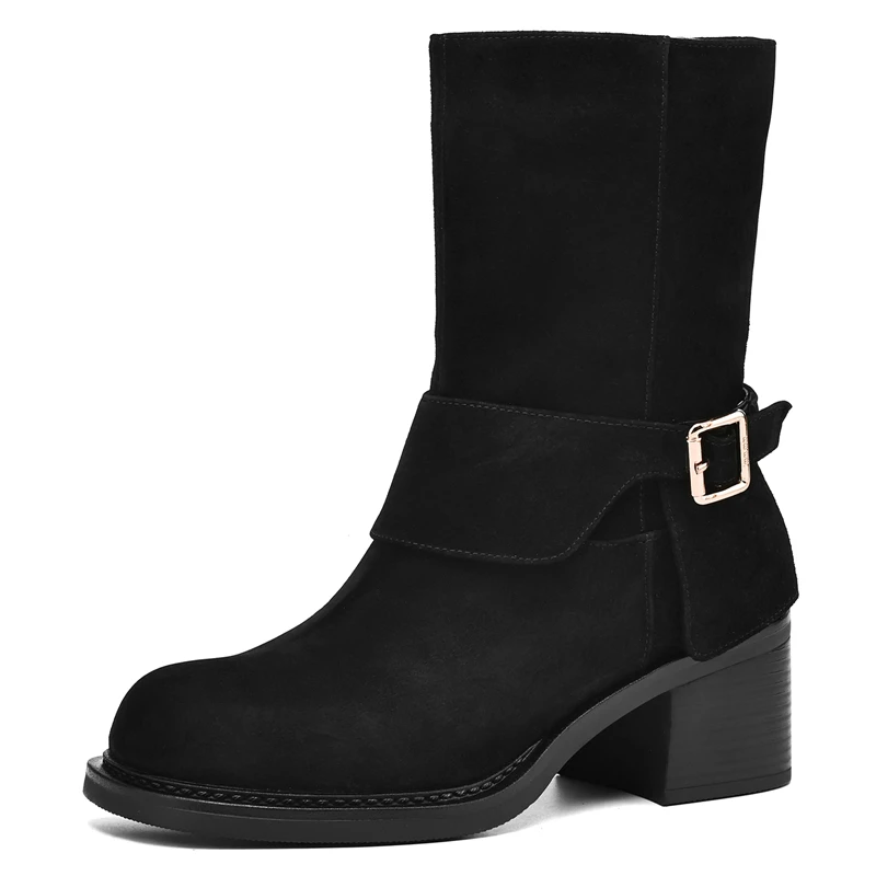 Genuine leather ankle boots with square heels and buckle