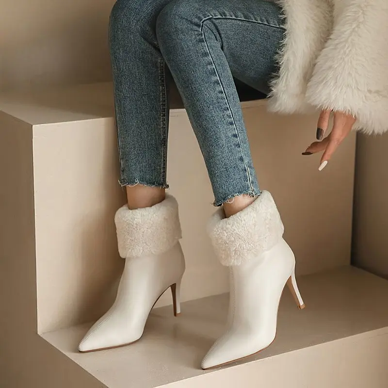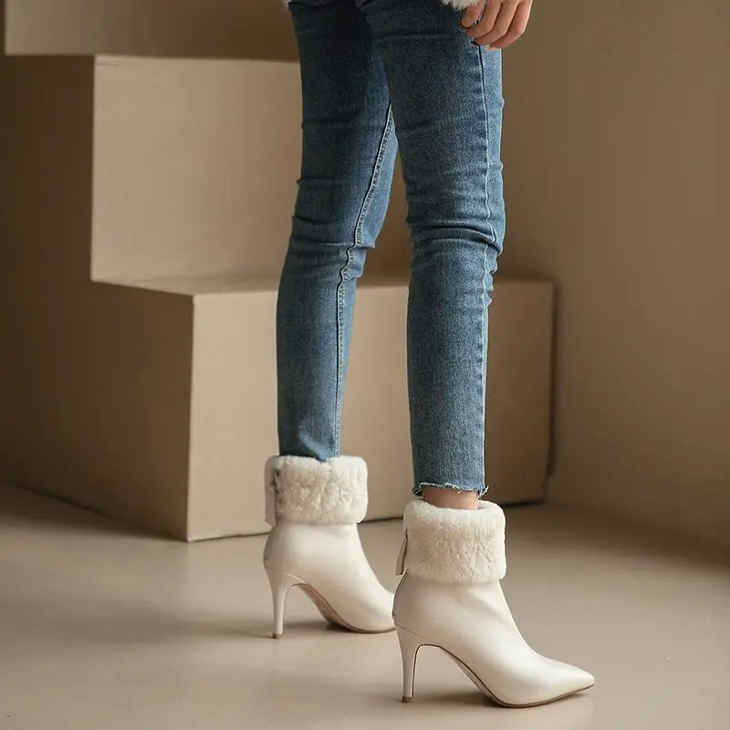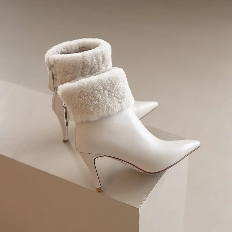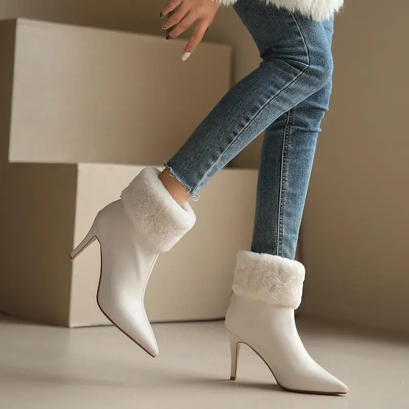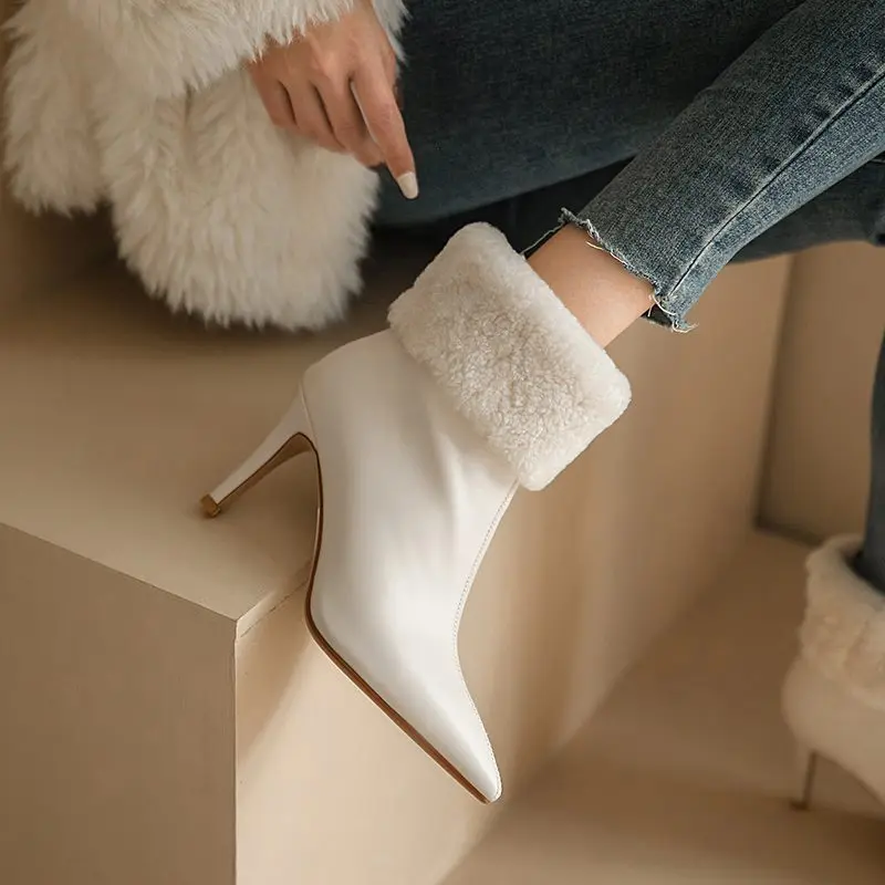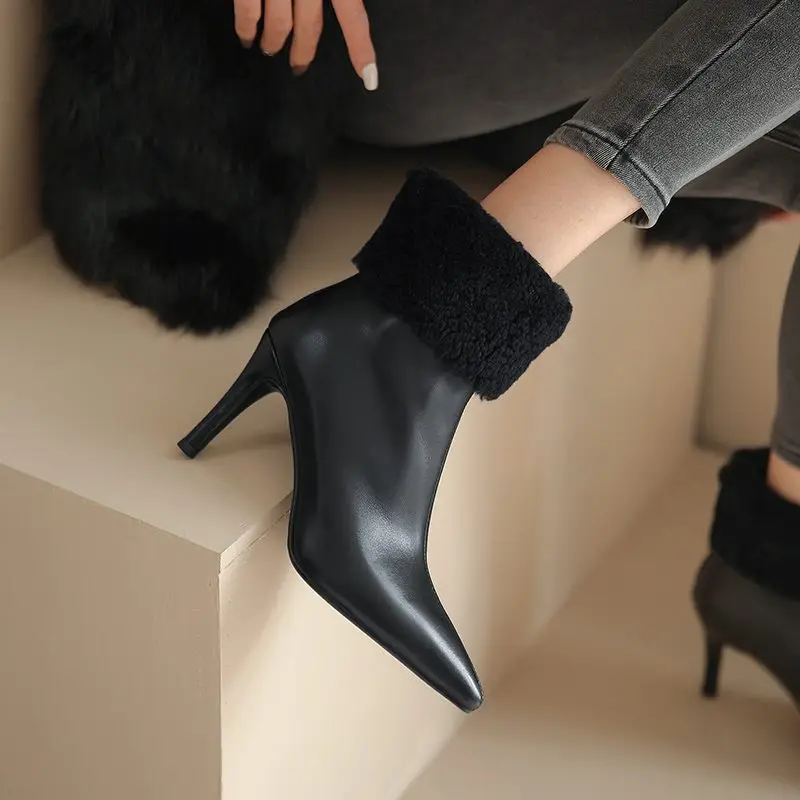 Genuine leather ankle boots with stiletto heels and fur lining