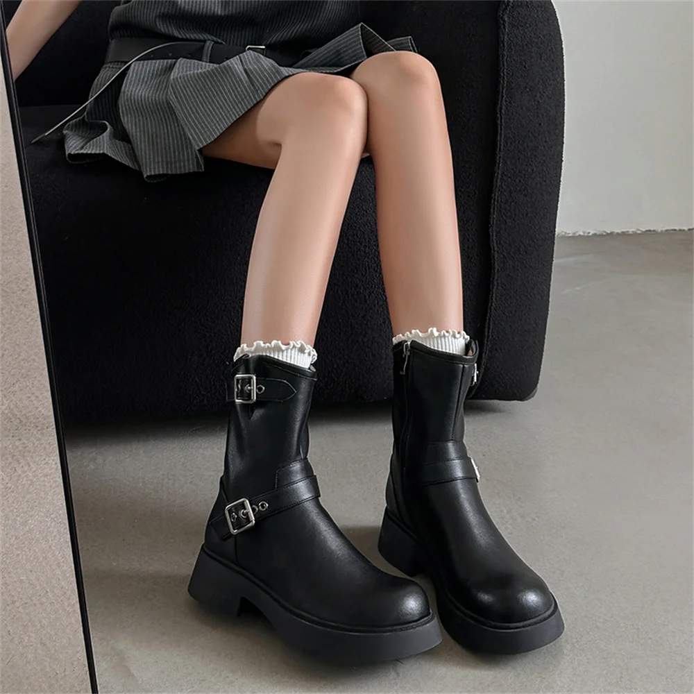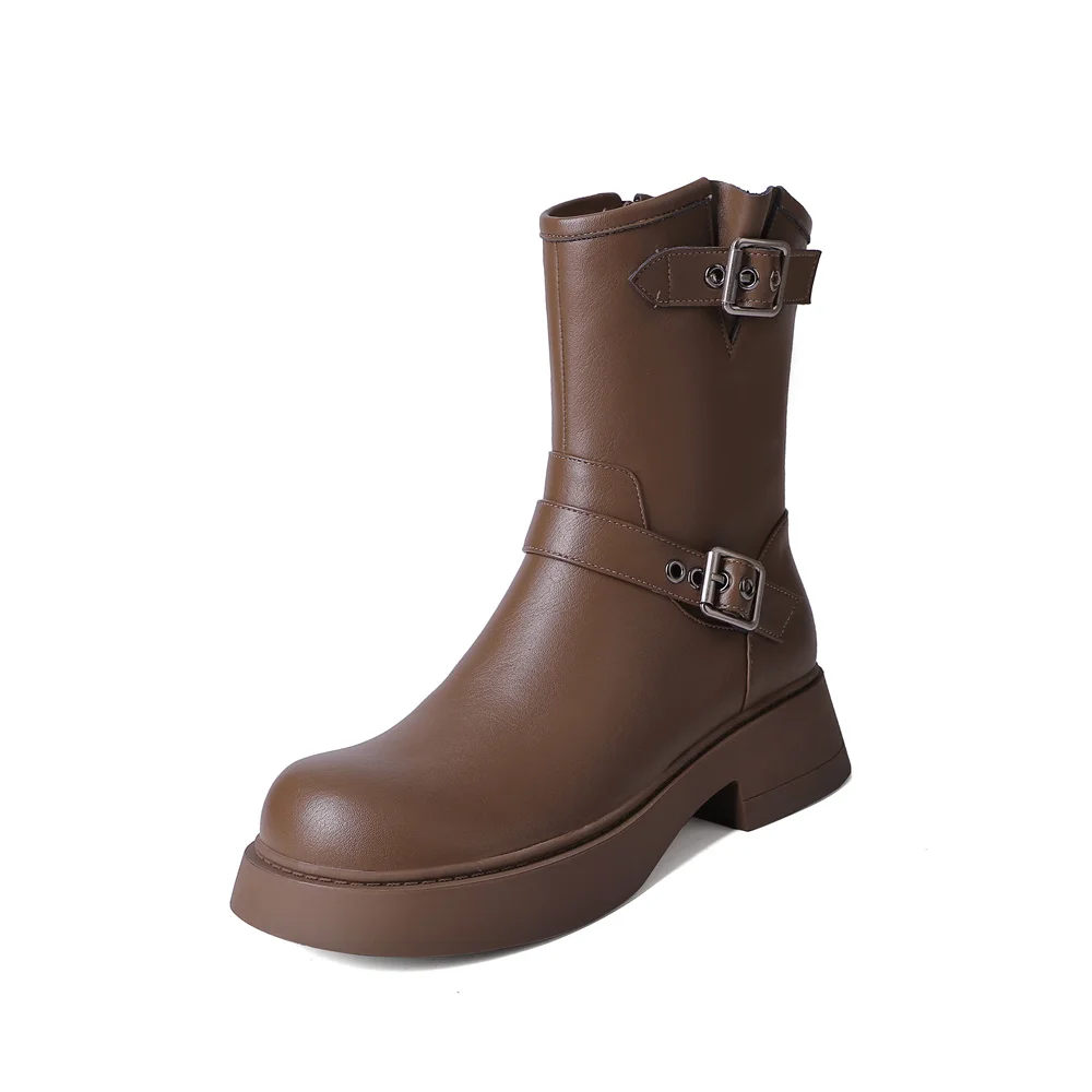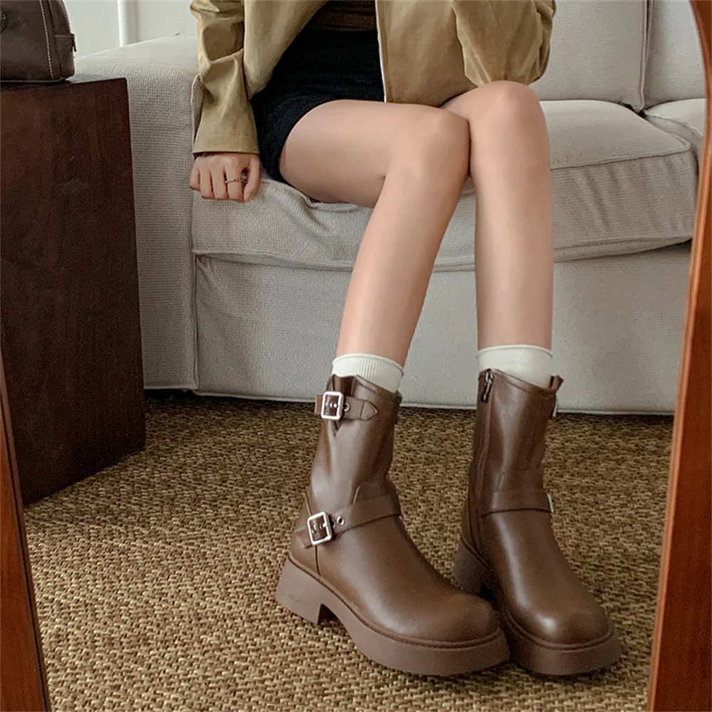 Genuine leather ankle boots with thick heels and buckles