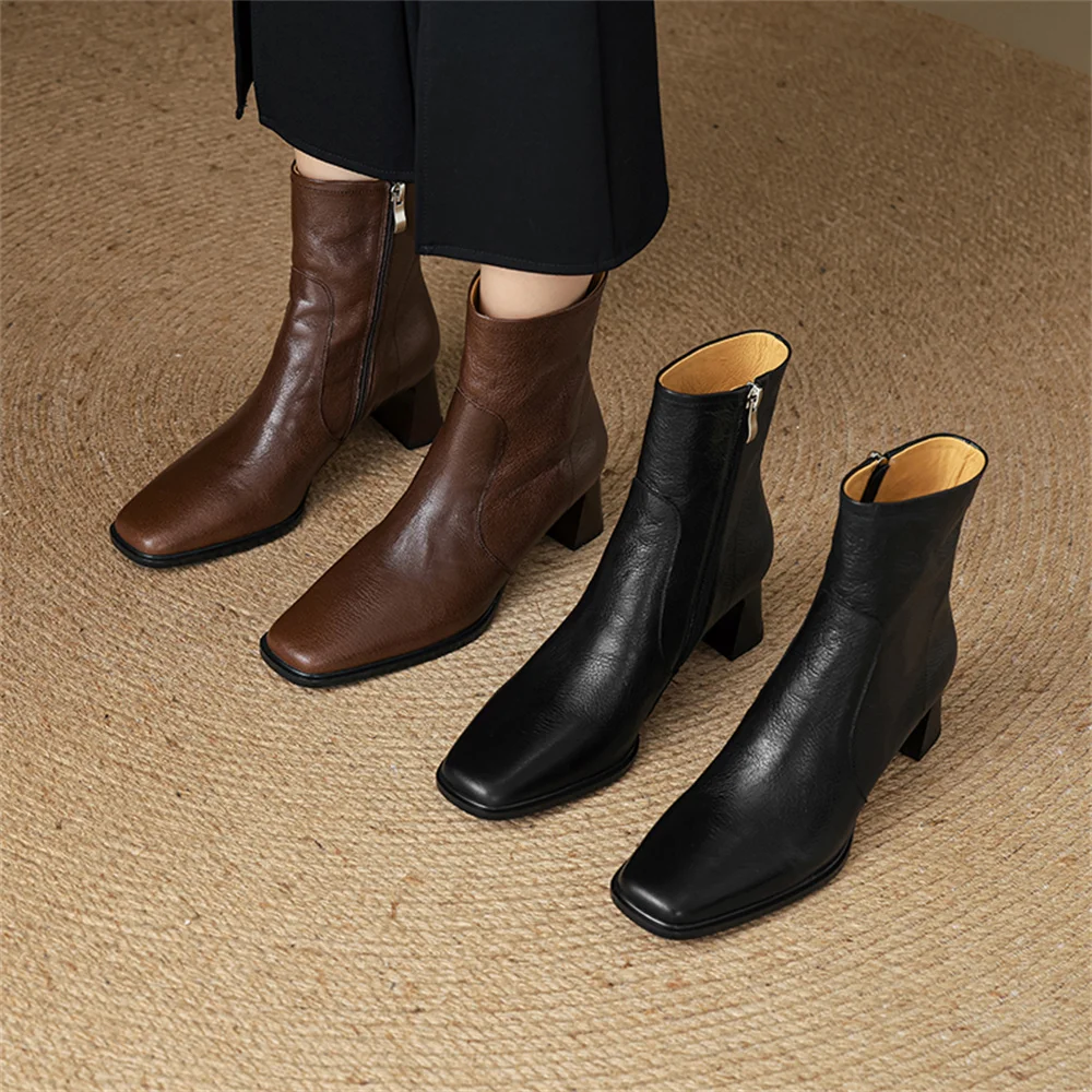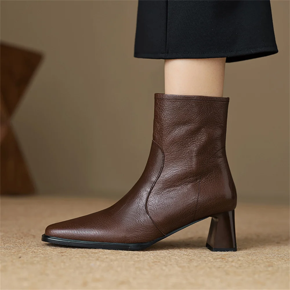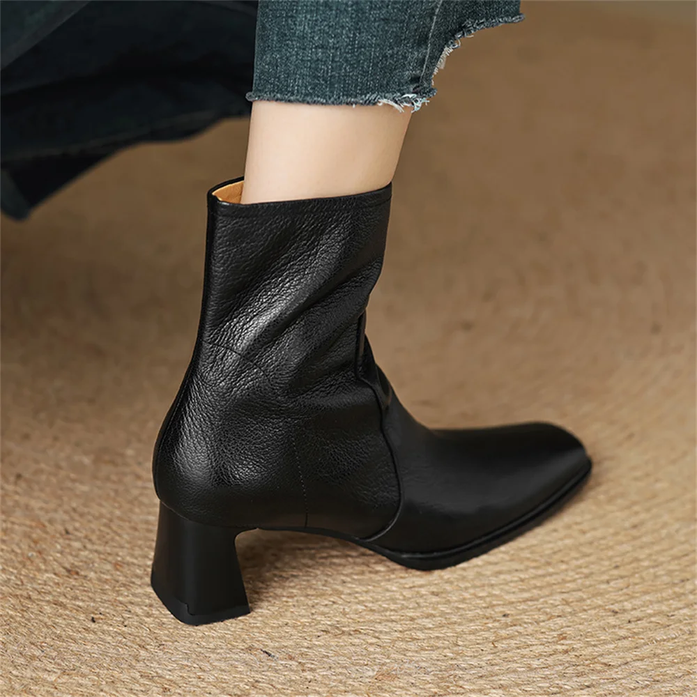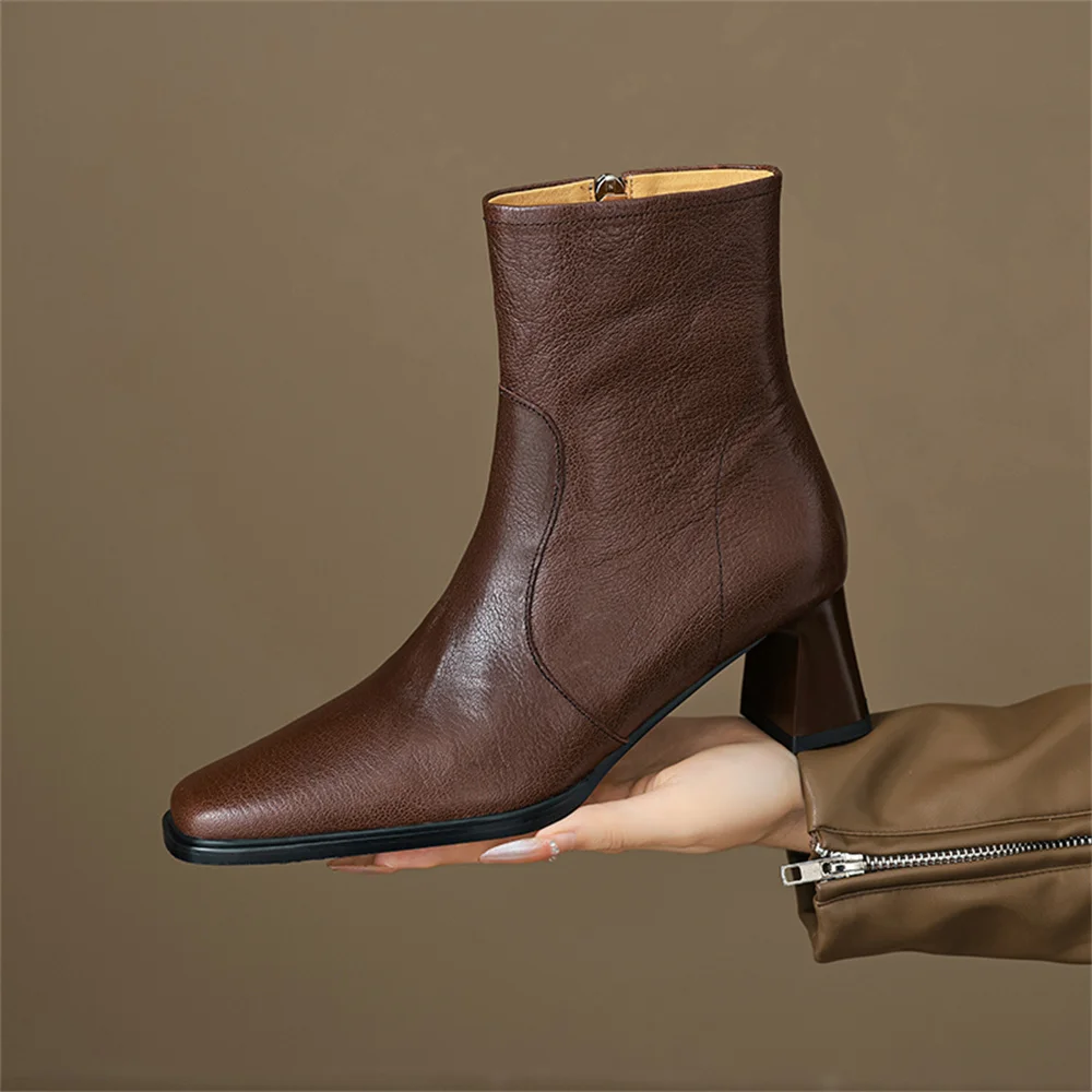 Genuine Leather Ankle Boots with Thick Heels and Side Zipper