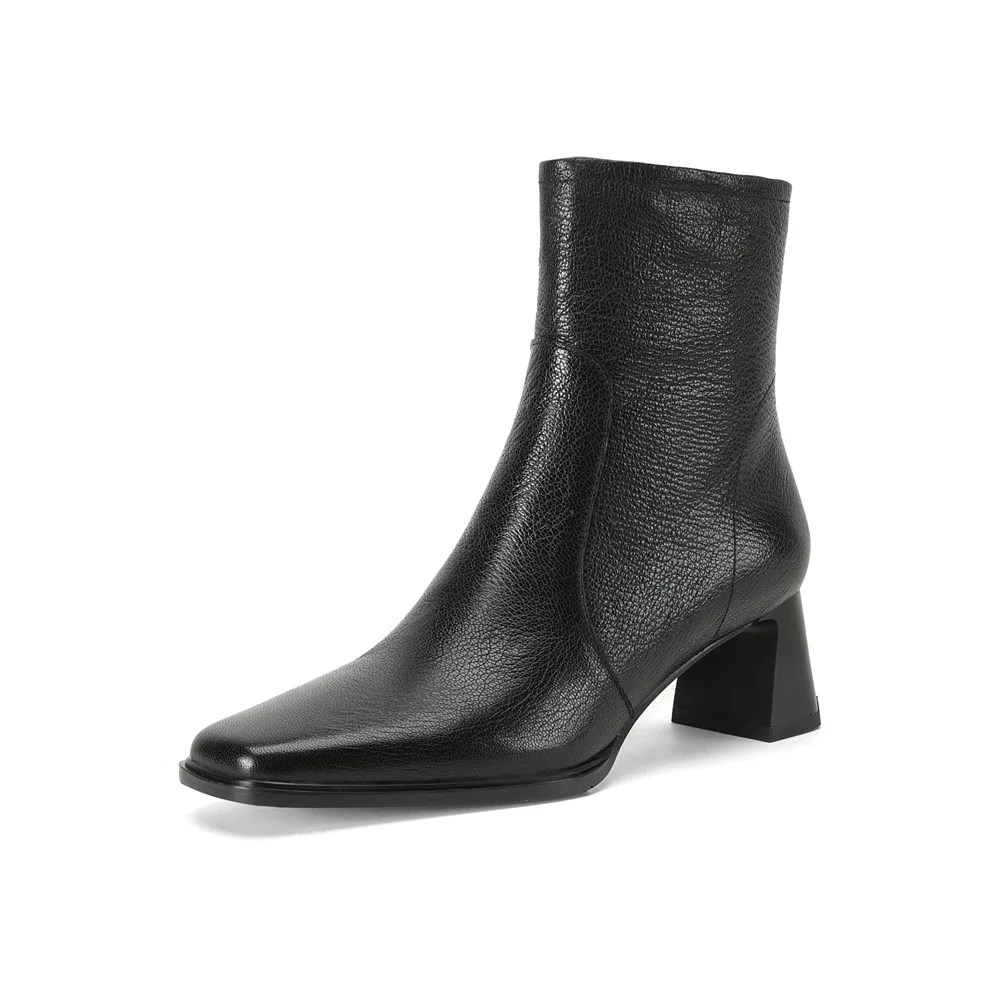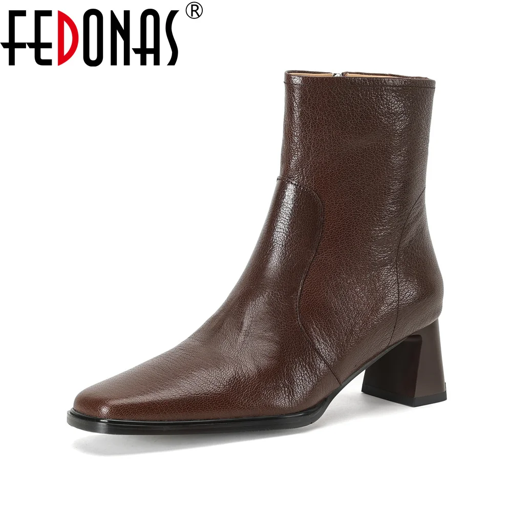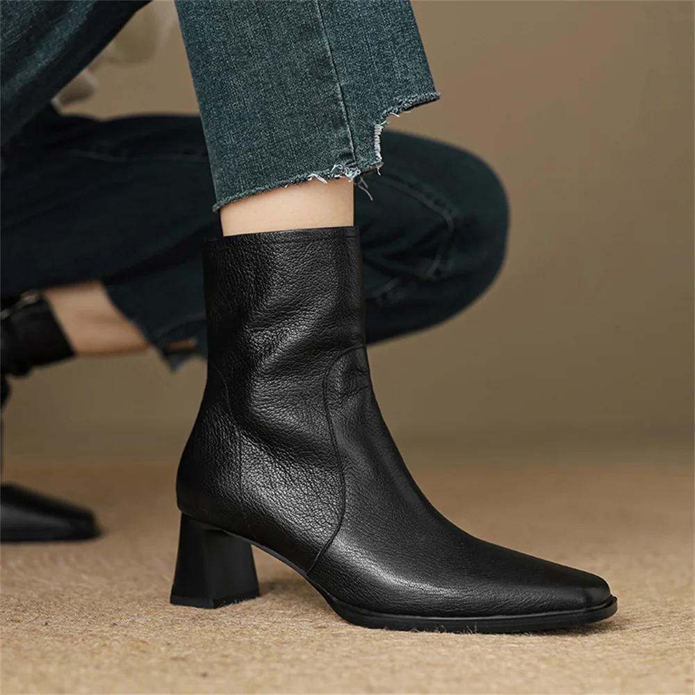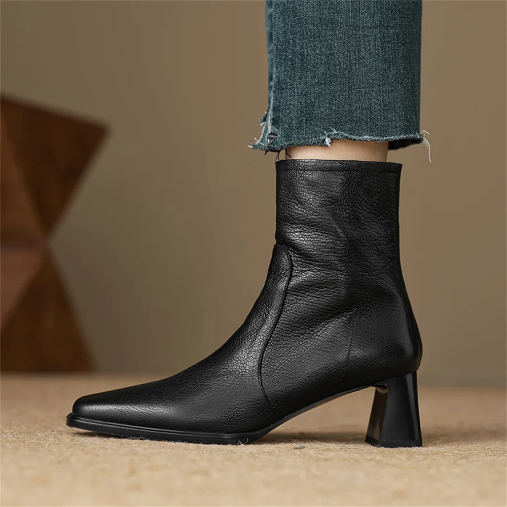 Genuine Leather Ankle Boots with Thick Heels and Side Zipper