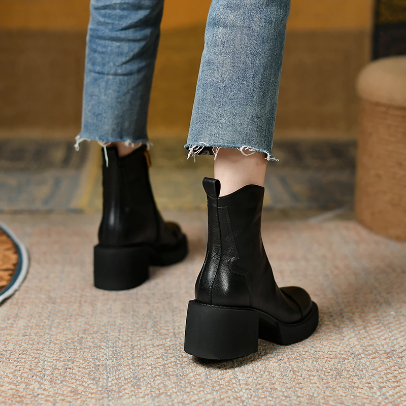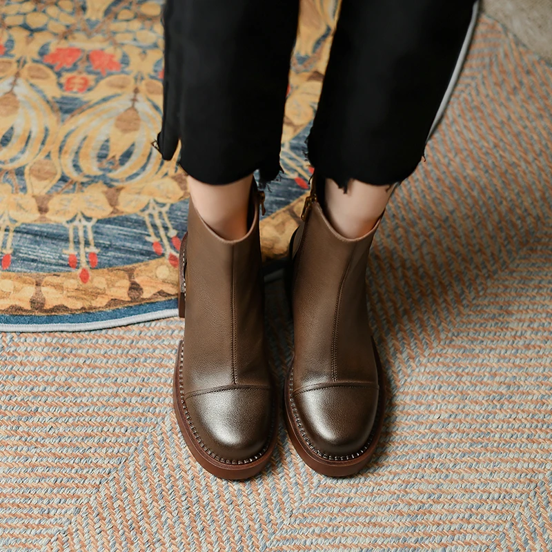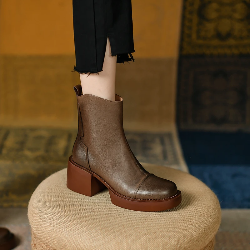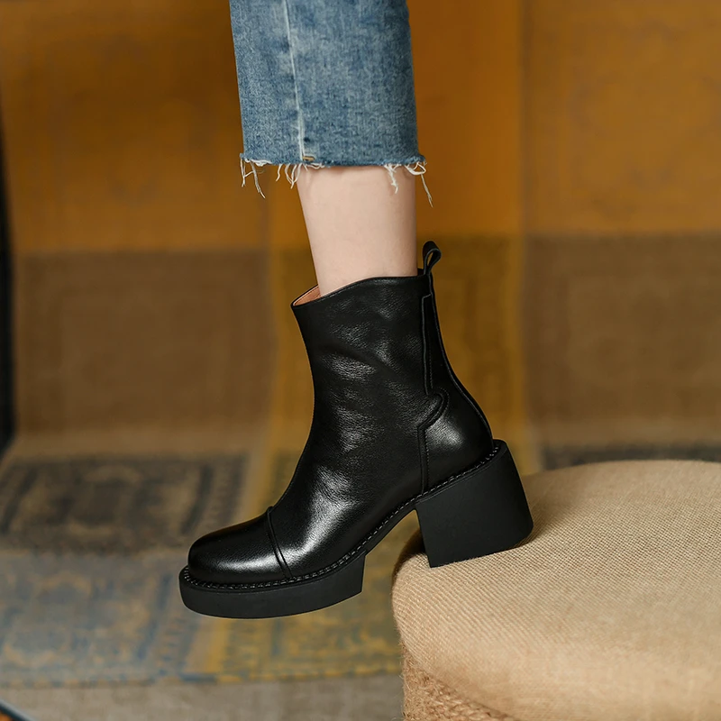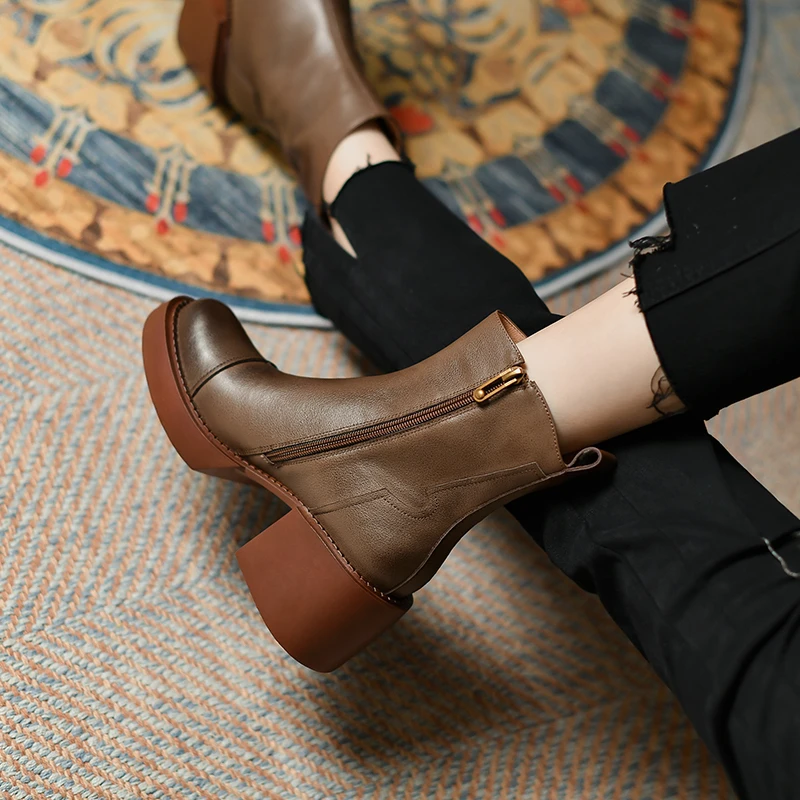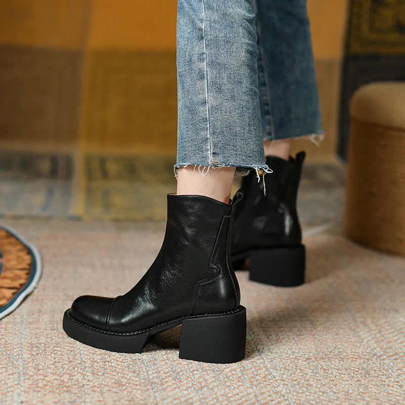 Genuine leather ankle boots with thick heels and side zipper