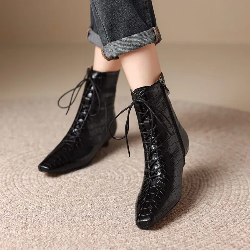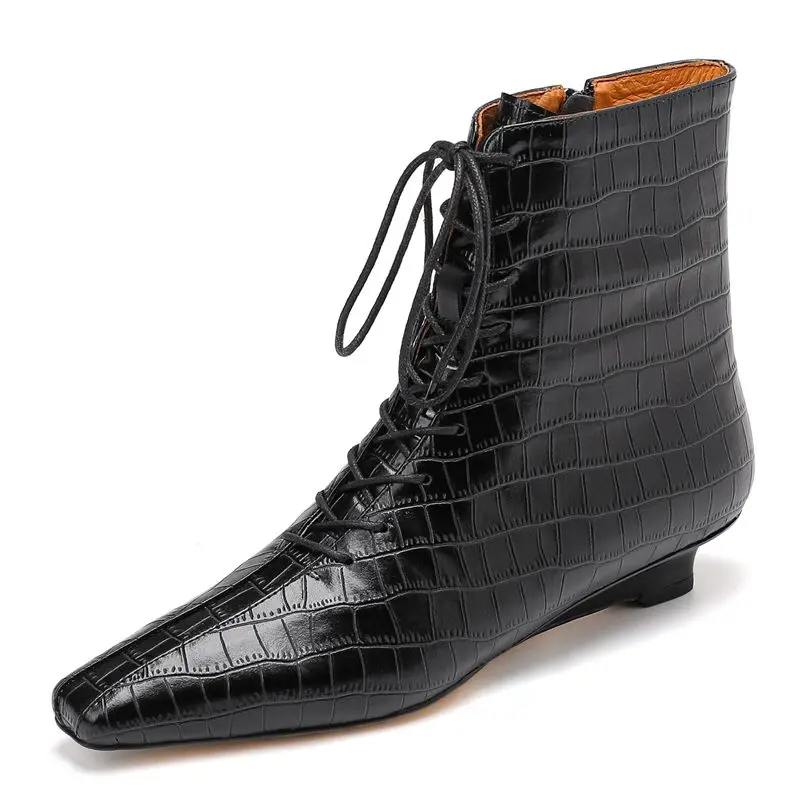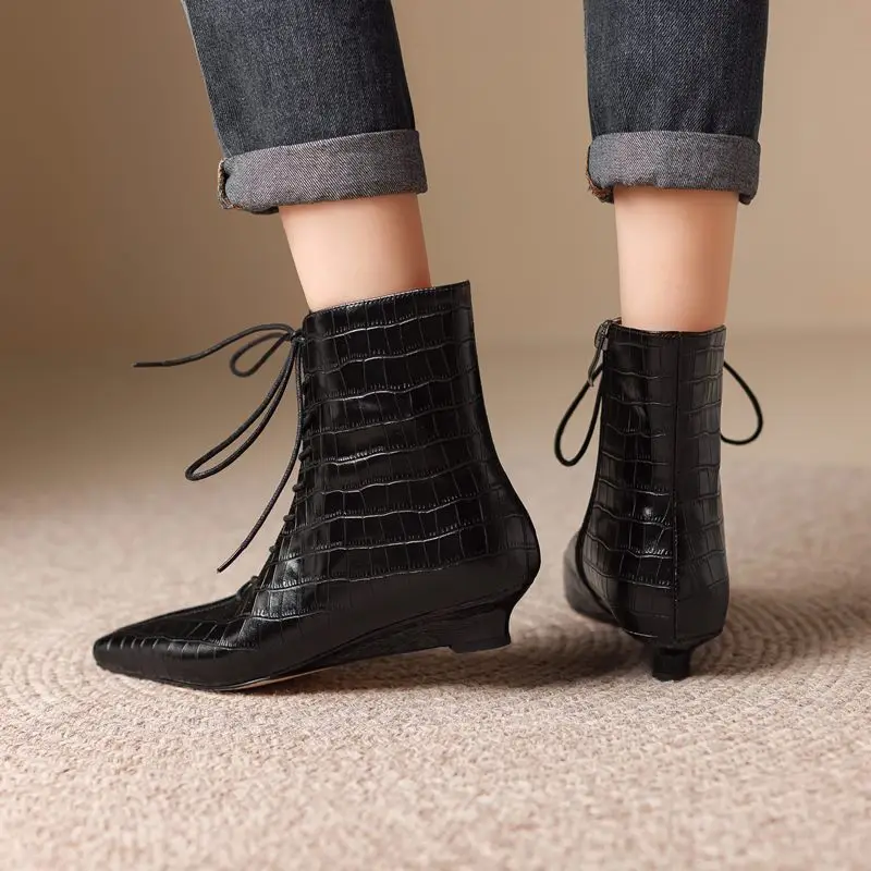 Genuine Leather Ankle Boots with Wedge Heels and Zipper