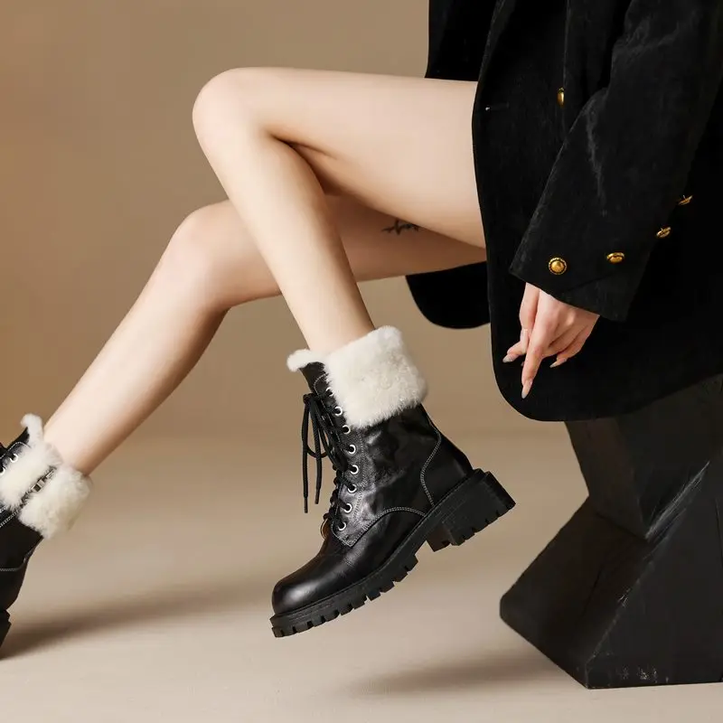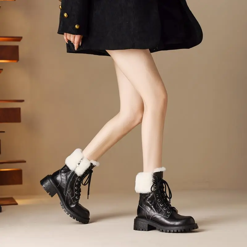 Genuine leather ankle boots with zipper and lace up, warm winter platform booties