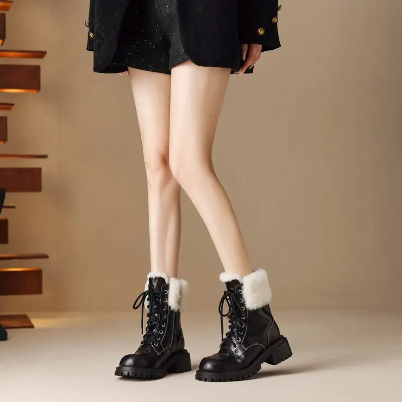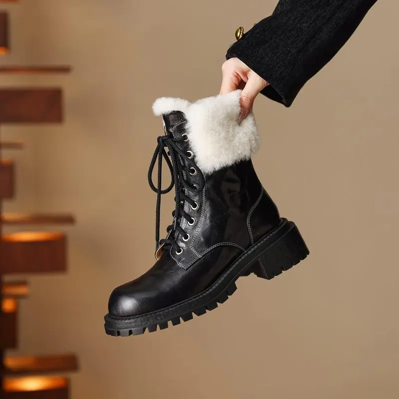 Genuine Leather Ankle Boots with Zipper and Lace Up, Warm Winter Platform Booties