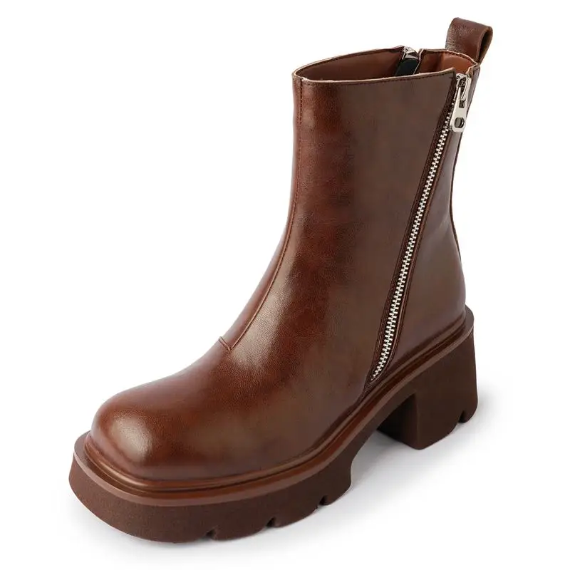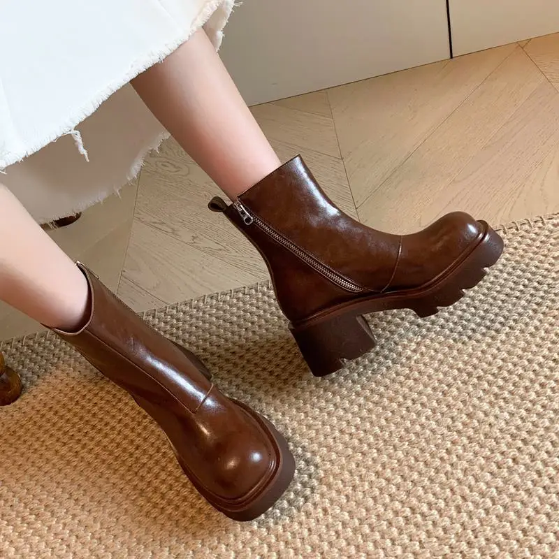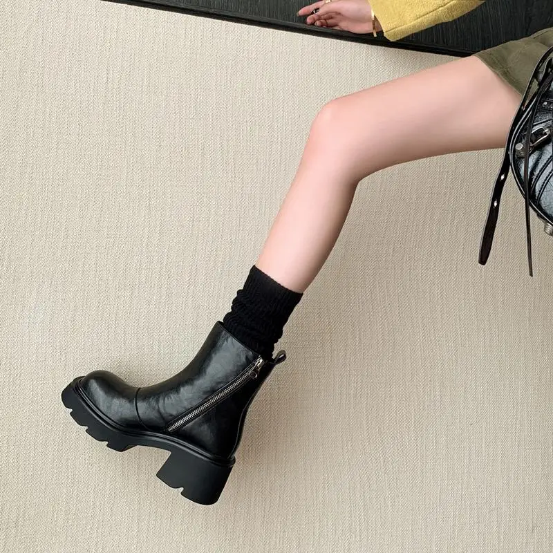 Genuine Leather Ankle Boots with Zipper and Square Heels