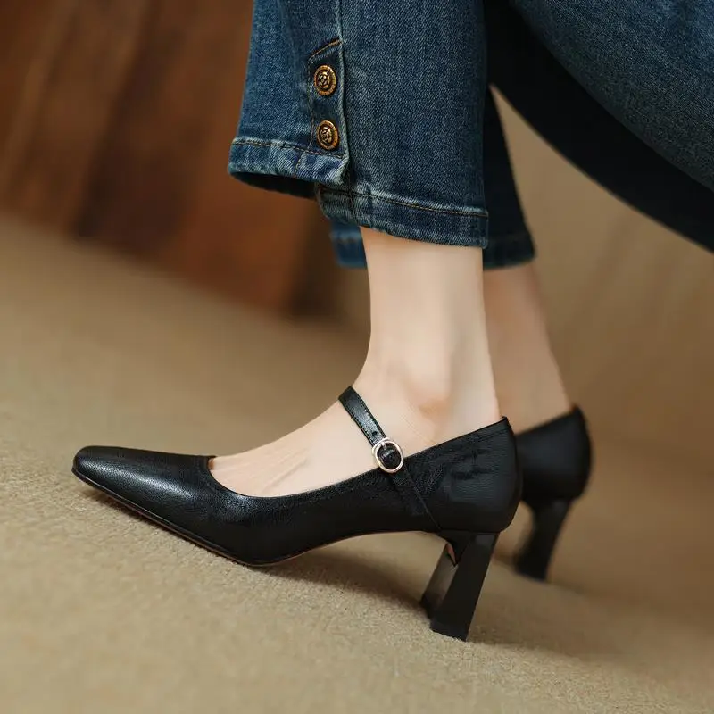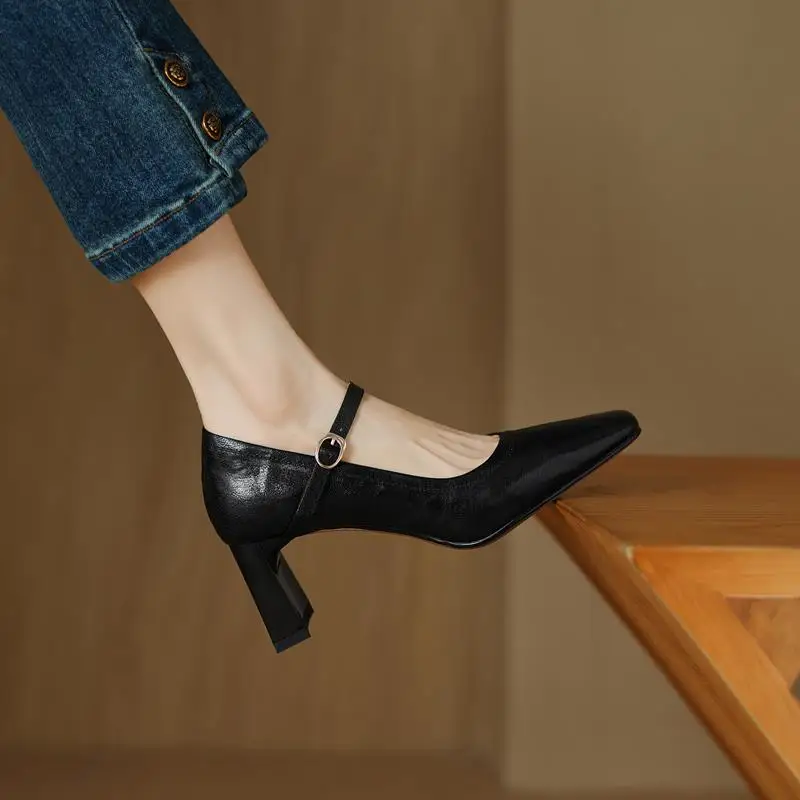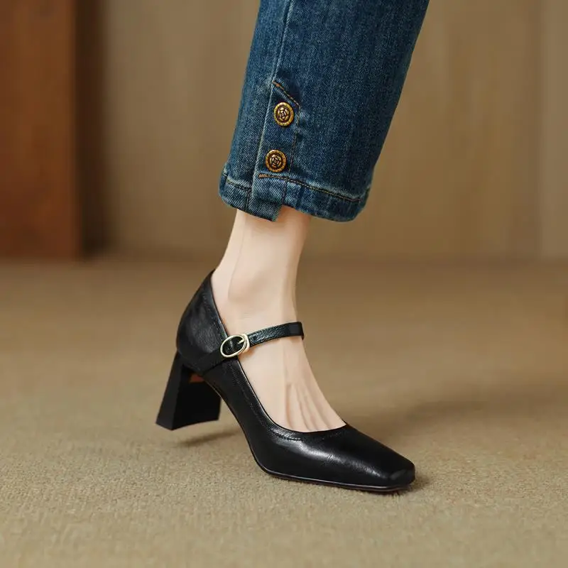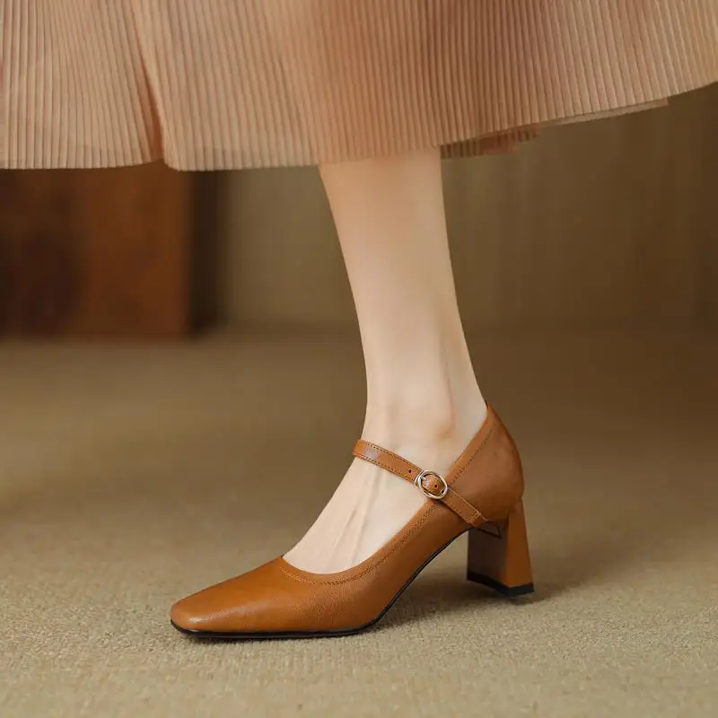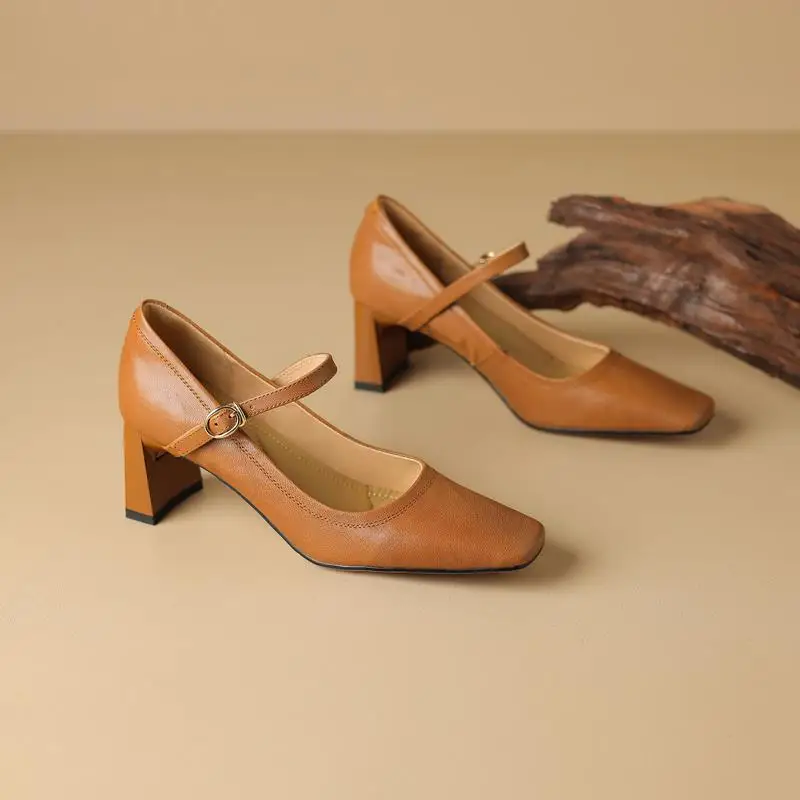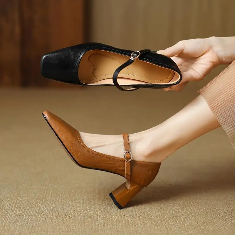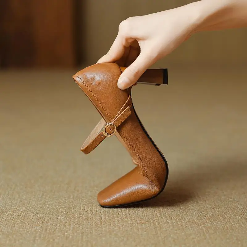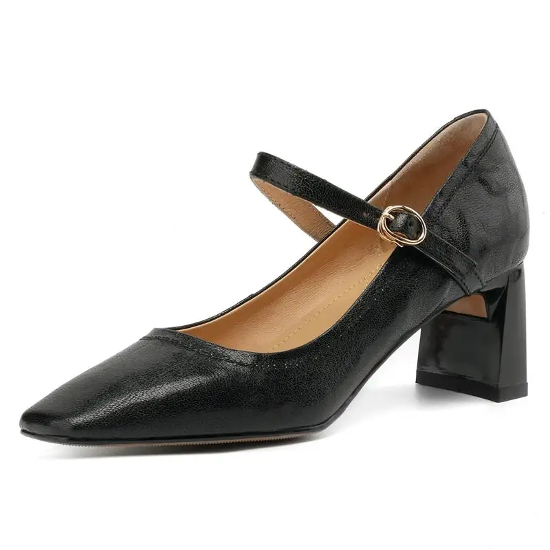 Elevate Your Style with Our Genuine Leather Chunky Heels Mary Jane Pumps