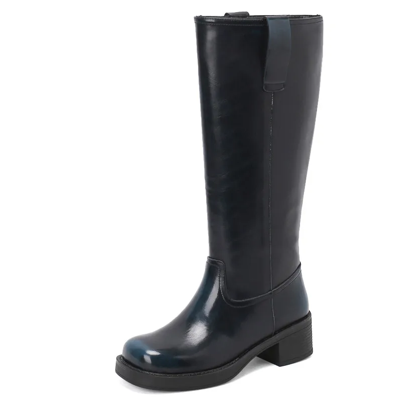 Genuine leather knee high slip on winter boots with platform heels