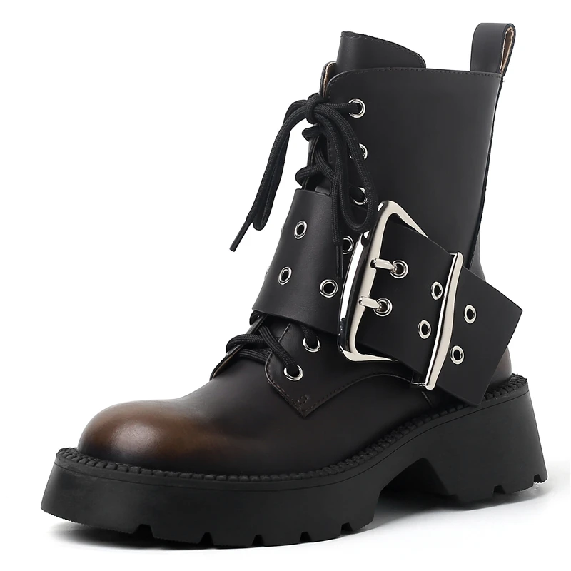 Genuine leather motorcycle ankle boots with buckle