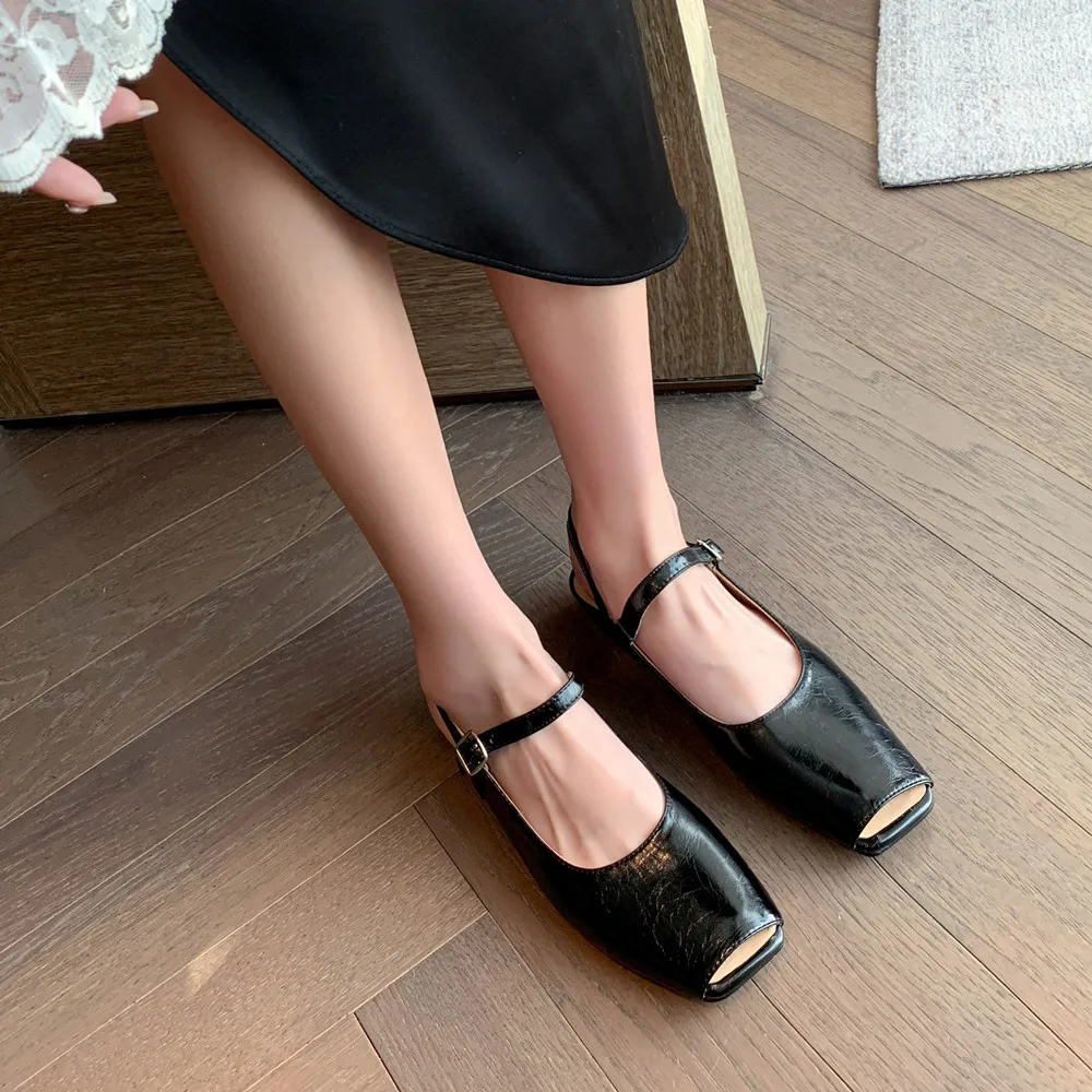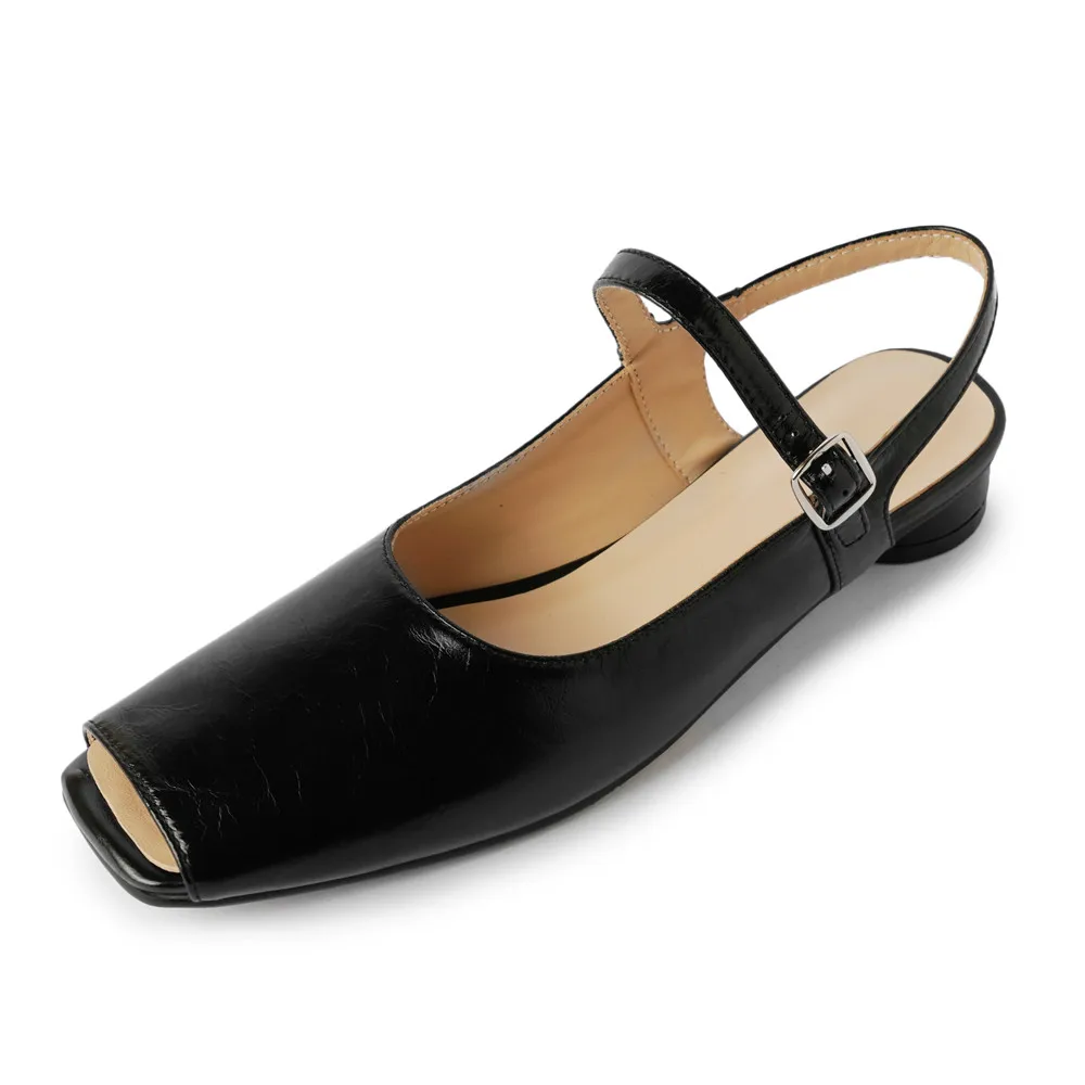 Genuine leather peep toe low heel pumps with buckle strap