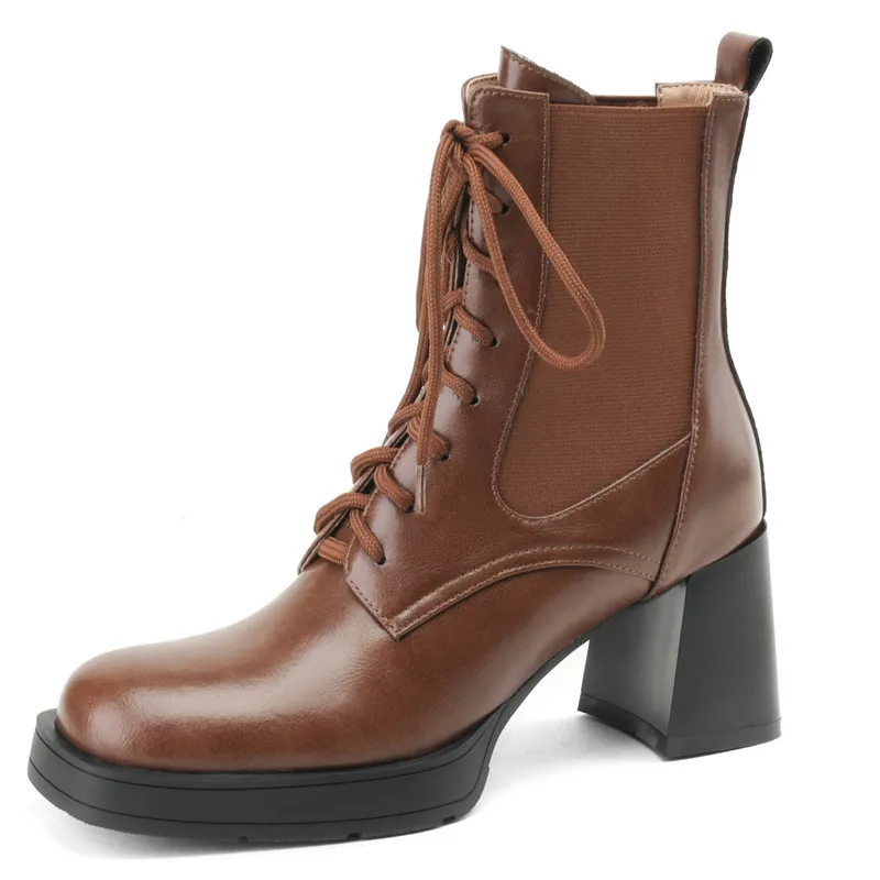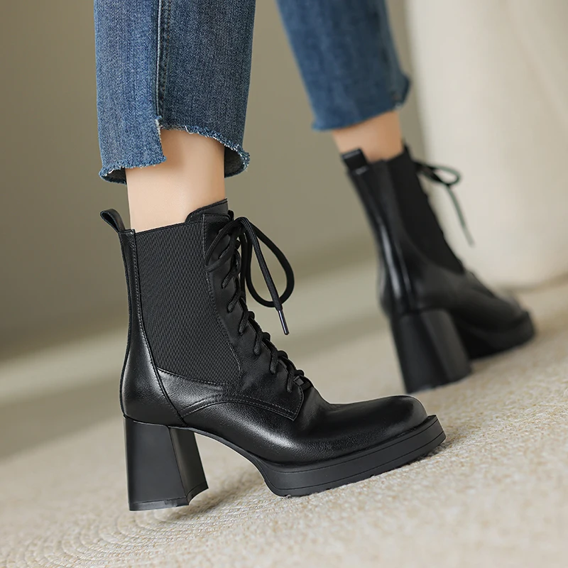 Genuine leather platform ankle boots with high heels