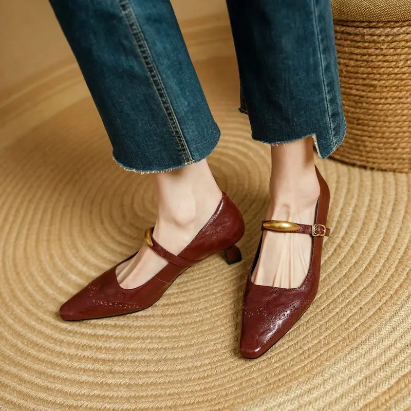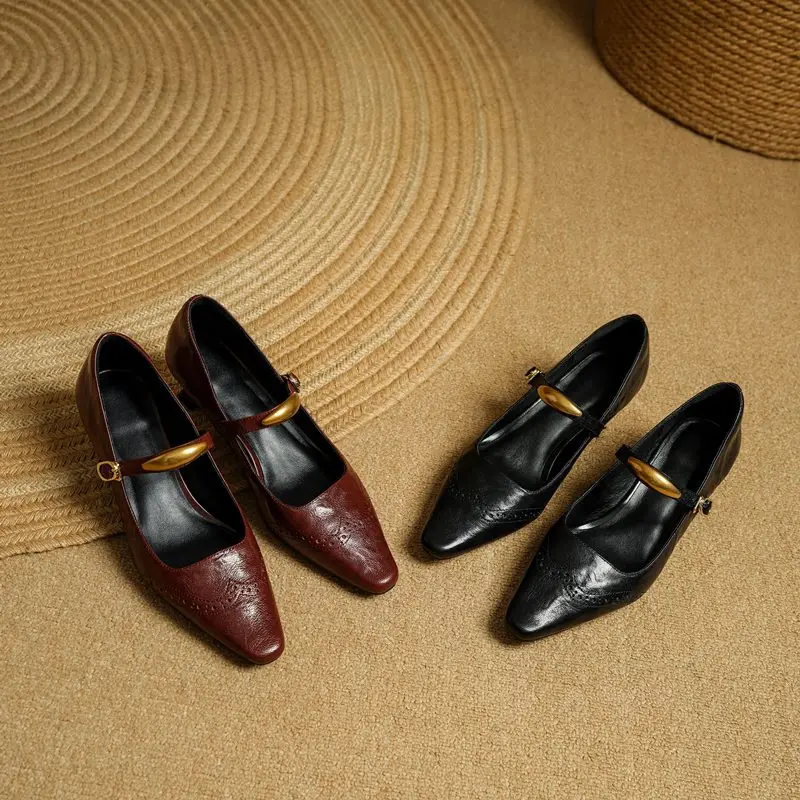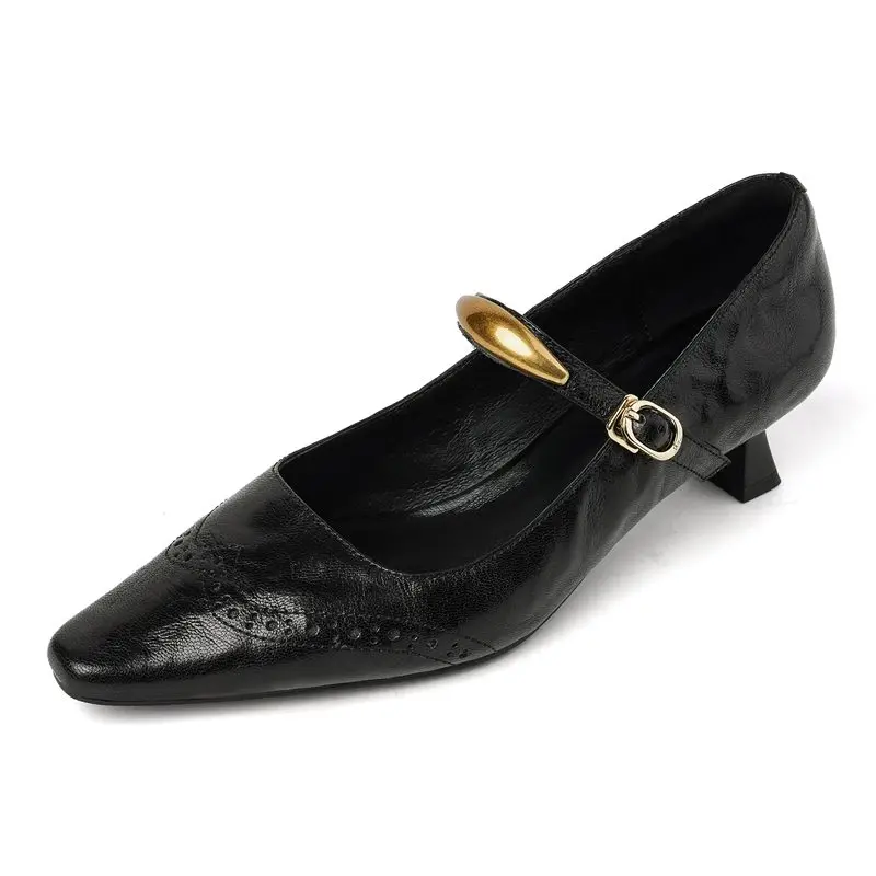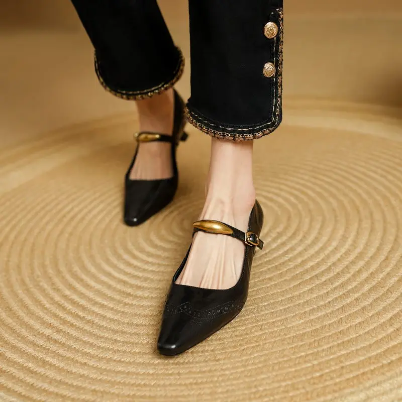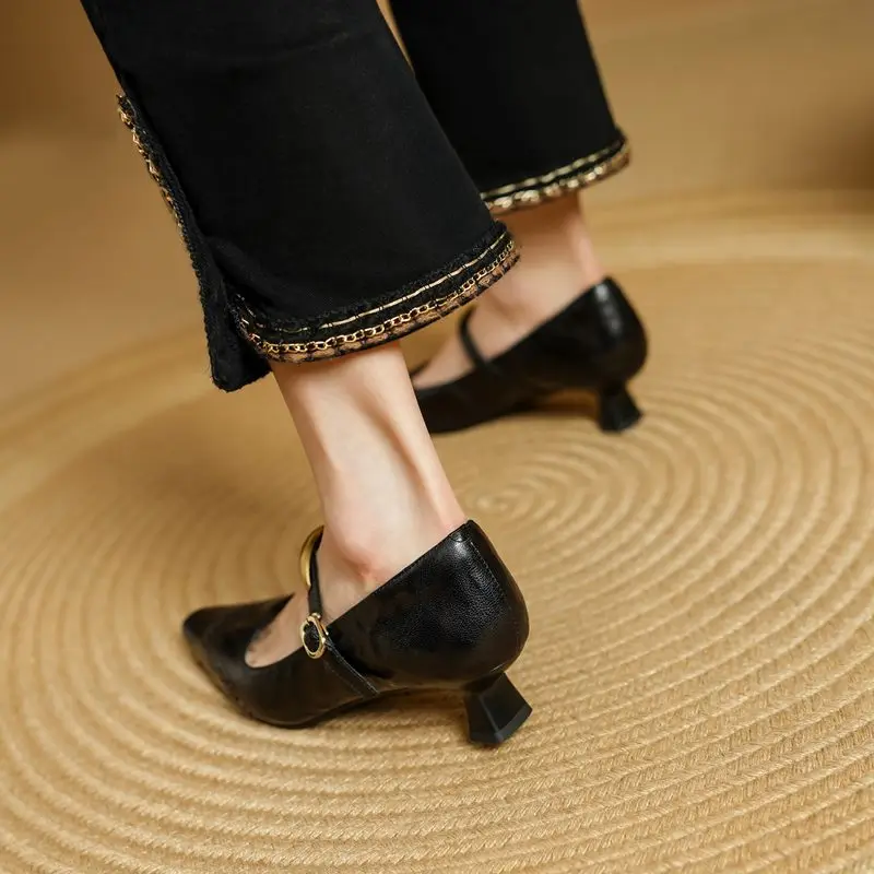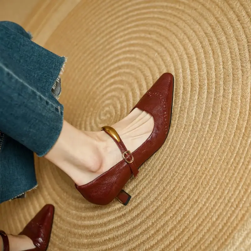 Elevate your footwear collection with our Genuine Leather Pointed Toe Mary Janes Mid Heels and experience the perfect blend of style and comfort!