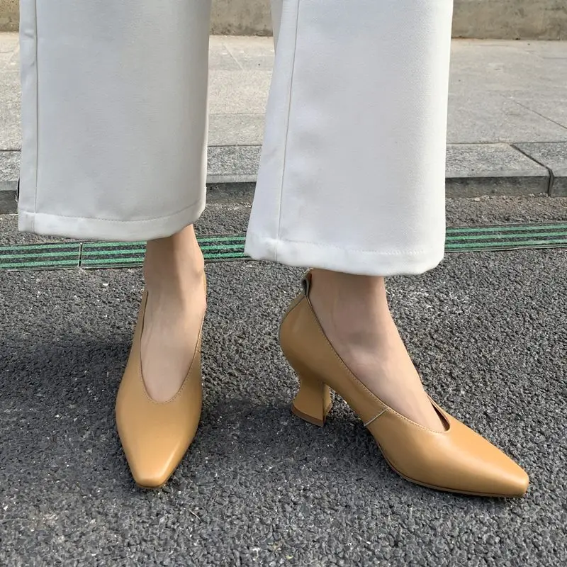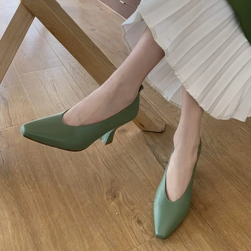 Genuine leather pointed toe slip-on pumps