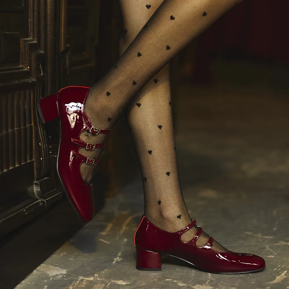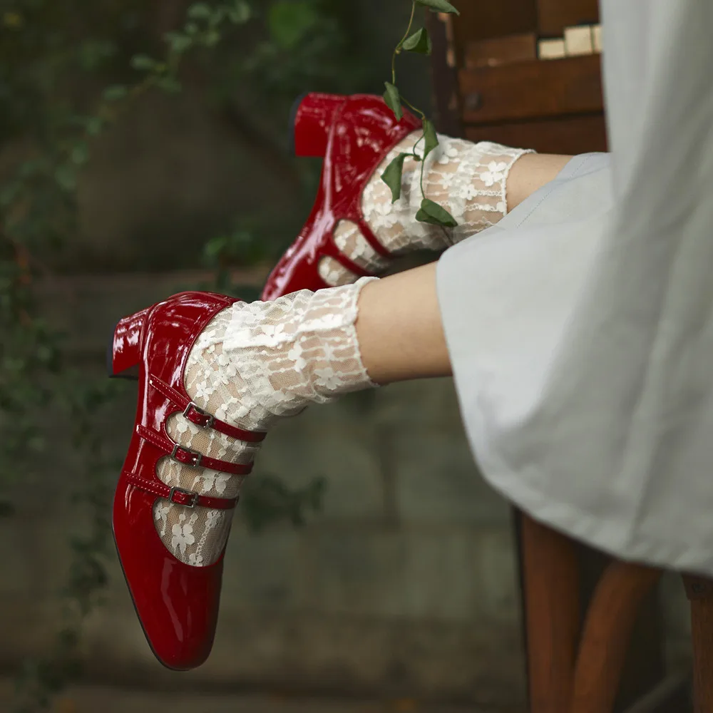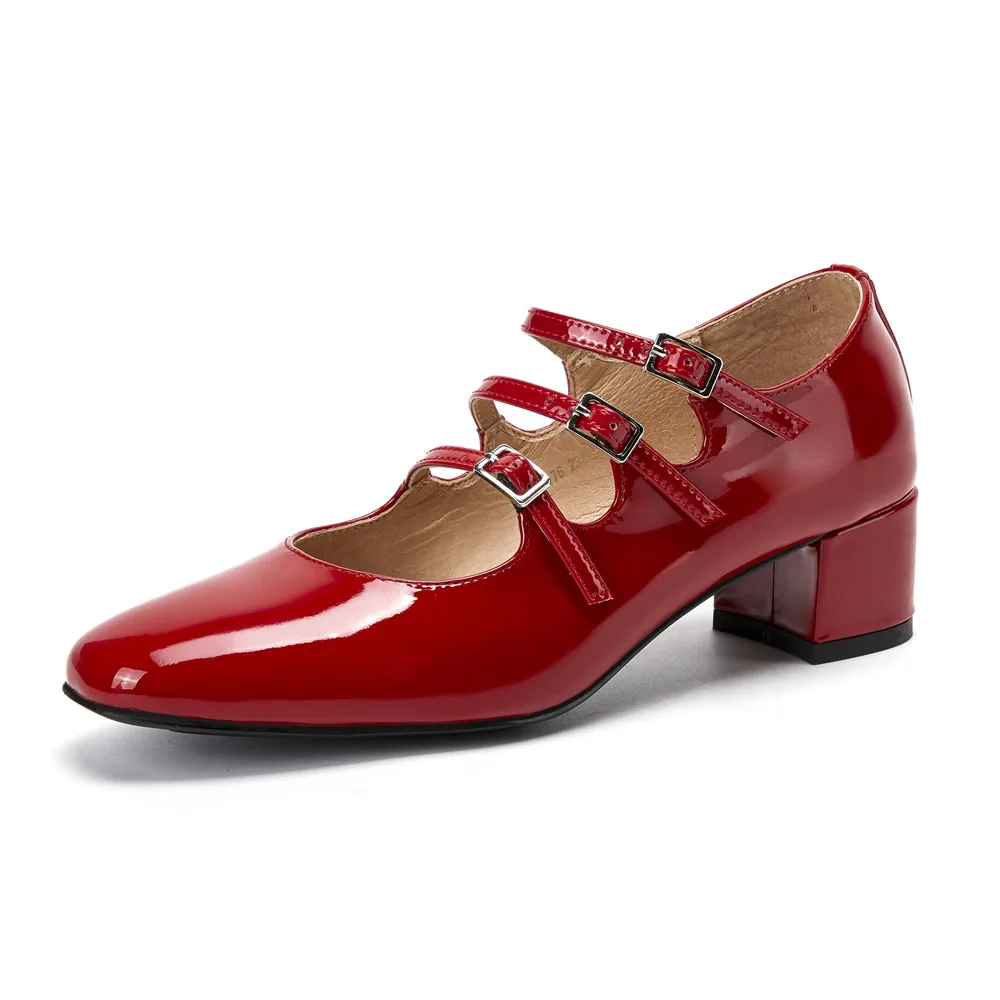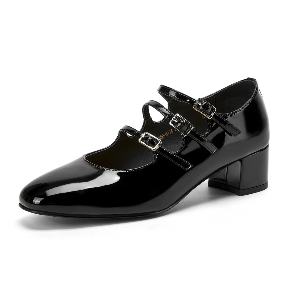 Genuine leather round toe mary jane pumps with buckle strap
