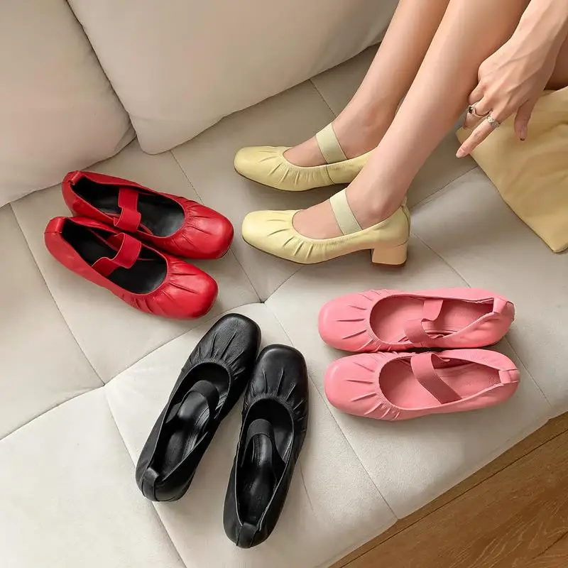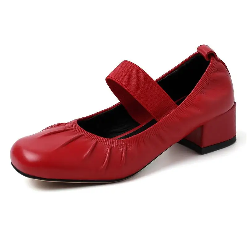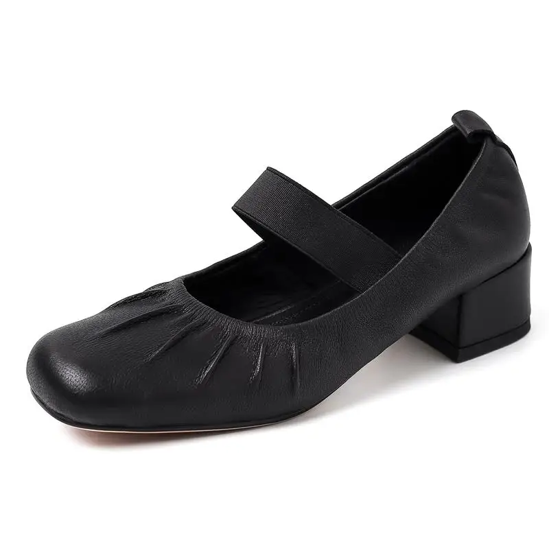 Genuine leather round toe mid heel pumps
