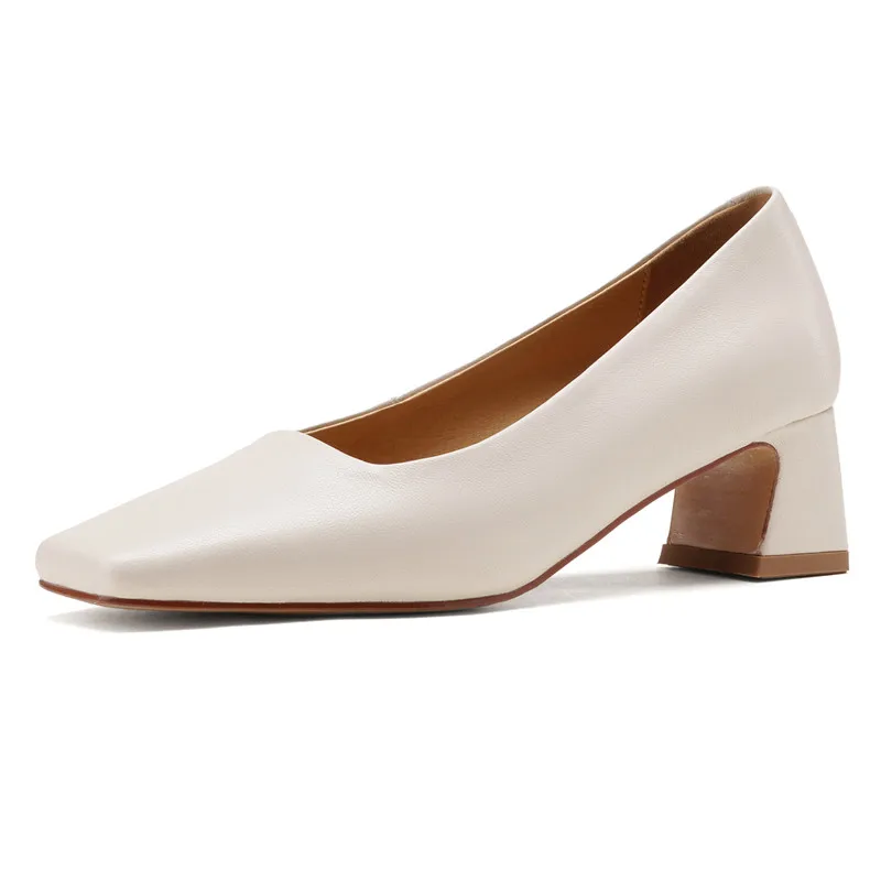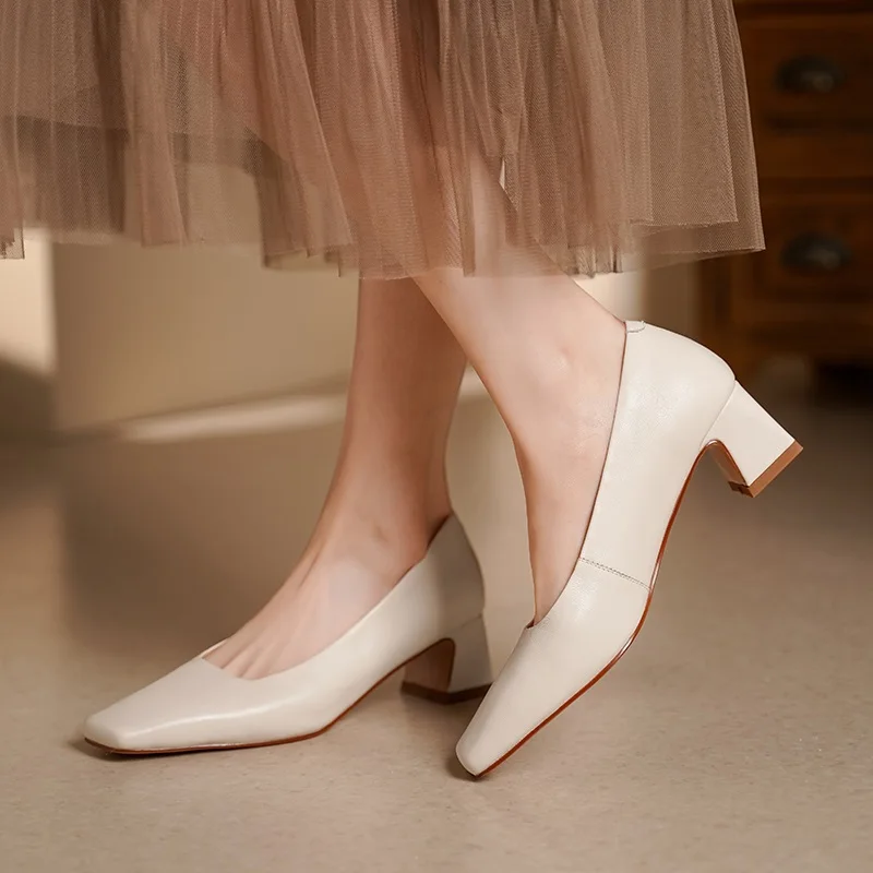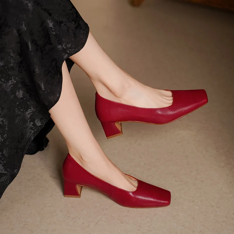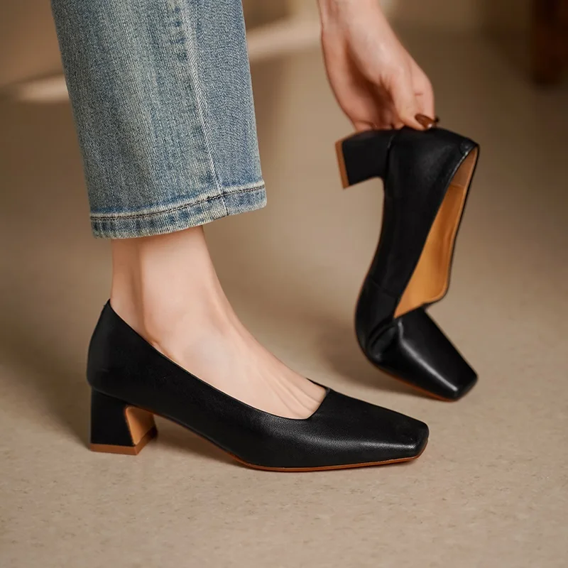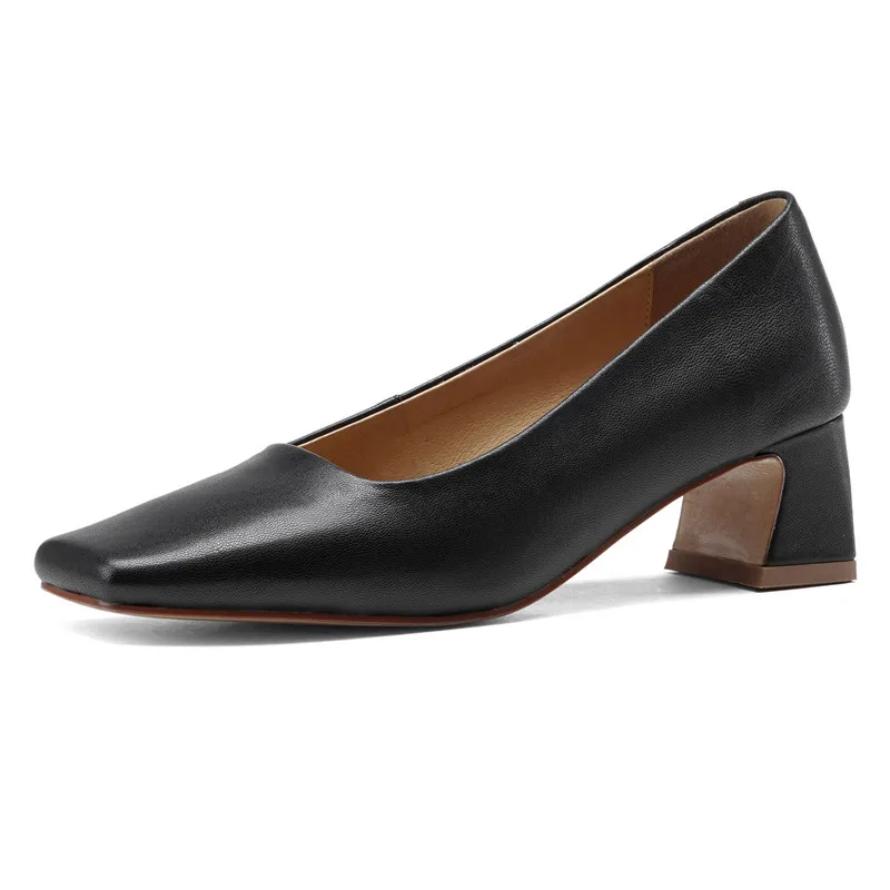 Genuine leather square toe mid heel pumps for office wear