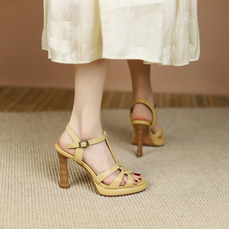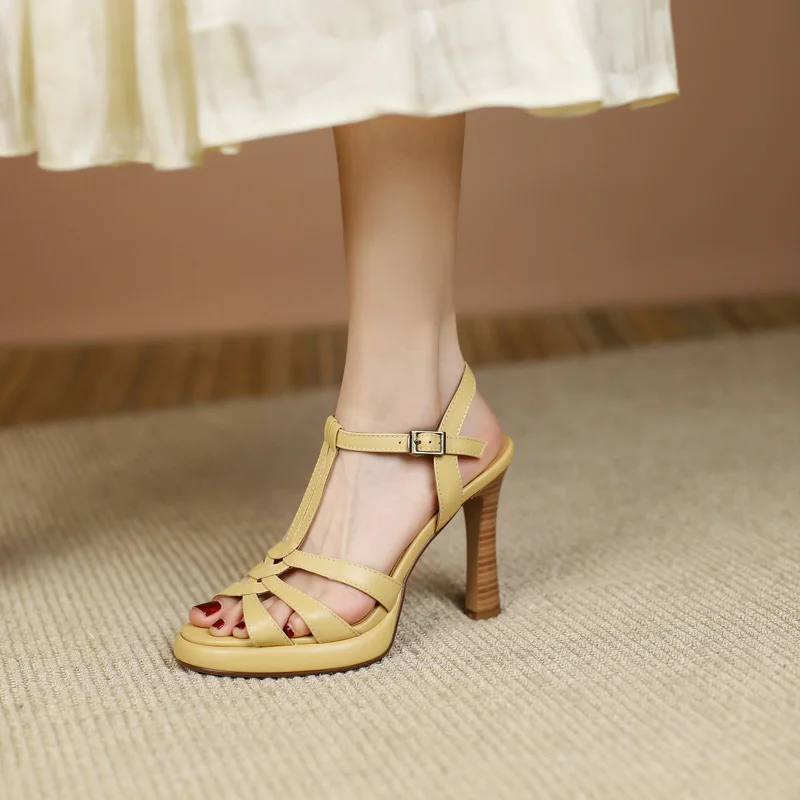 Genuine leather t-strap gladiator sandals with high heels