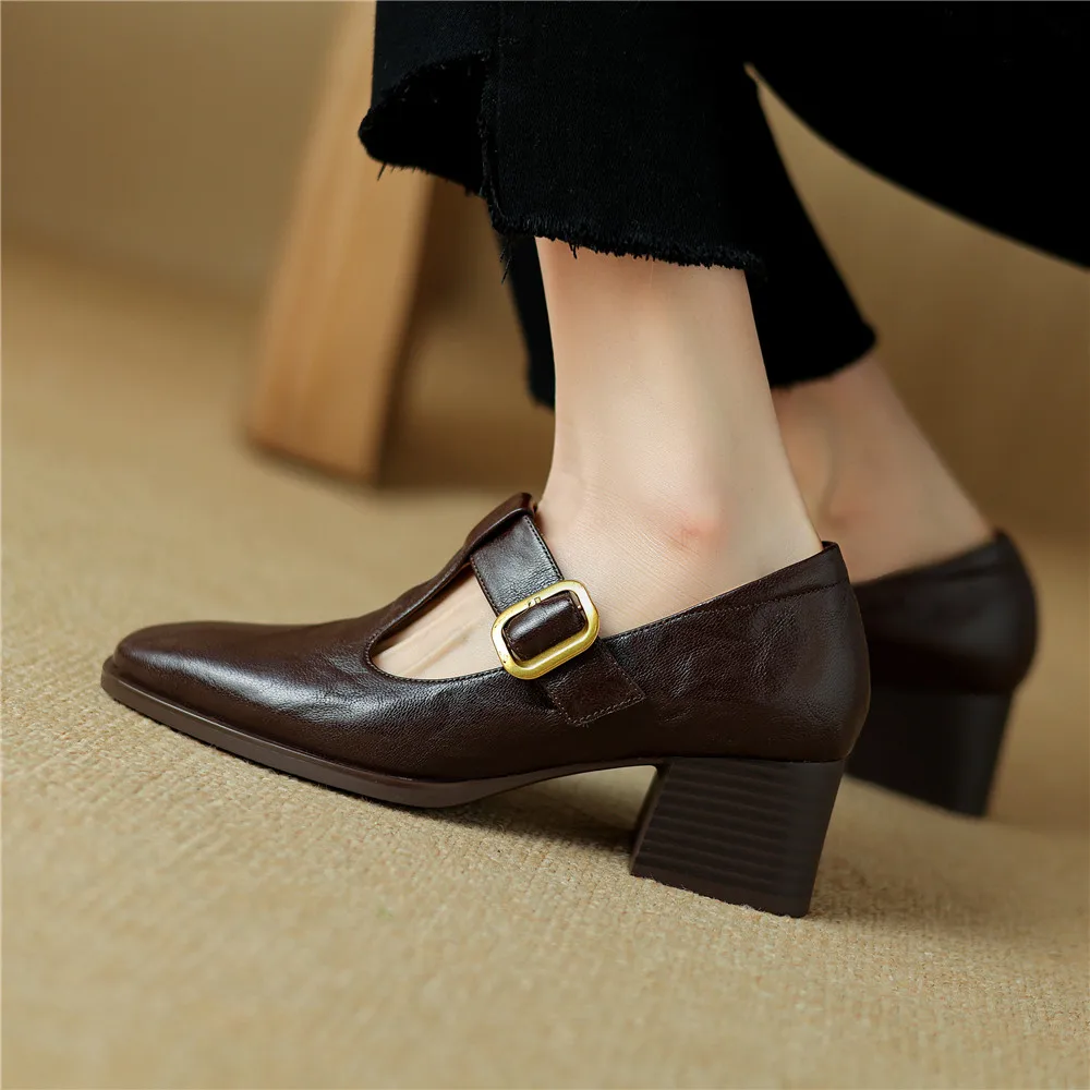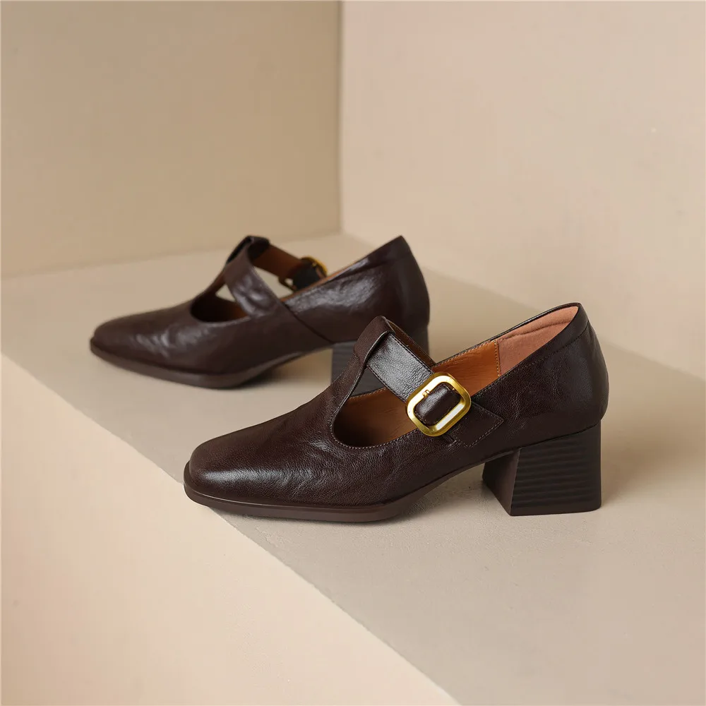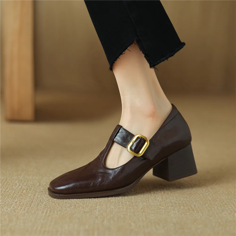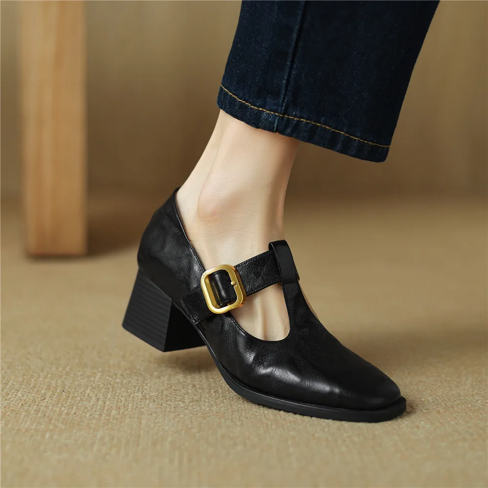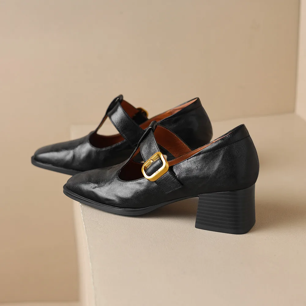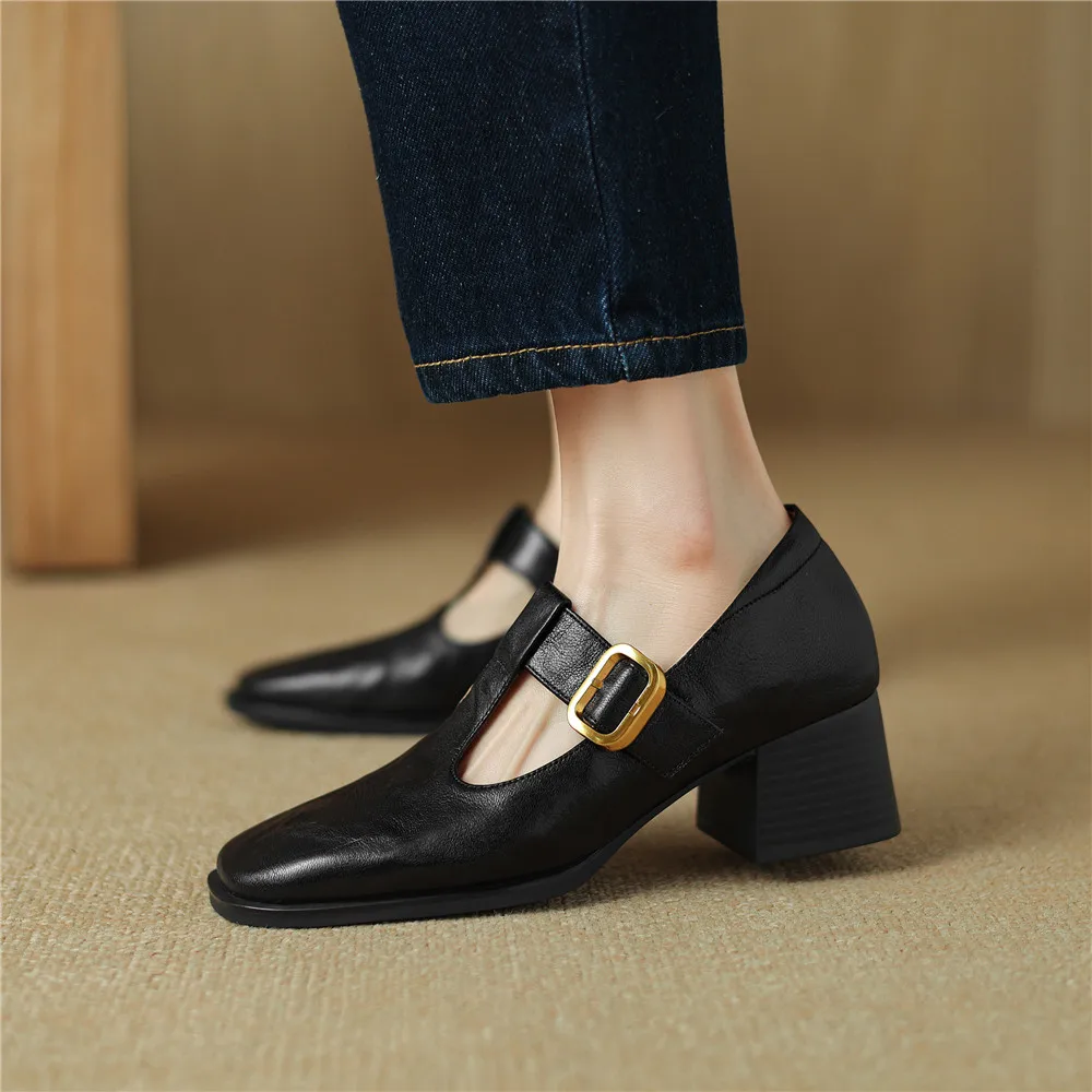Genuine leather thick heel square toe pumps for office