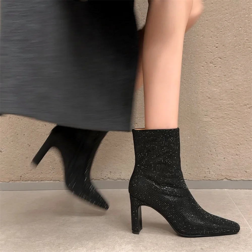 Elevate your footwear collection with our stunning Glitter High Heel Ankle Boots with Rhinestones. These boots are designed to make a statement, combining modern elegance with a touch of glamour. Perfect for both casual outings and special occasions, they are the ideal choice for fashion-forward individuals looking to add a sparkle to their step.