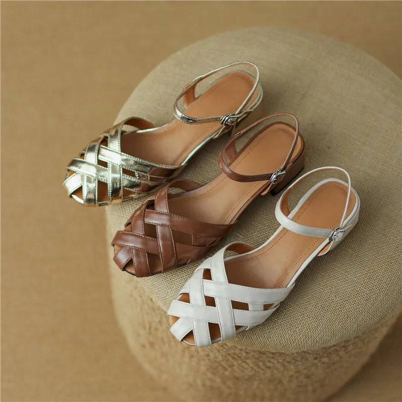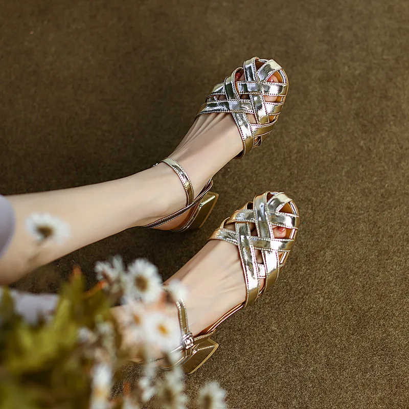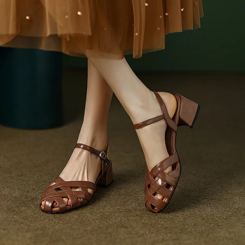 Hollow leather summer sandals with thick heels