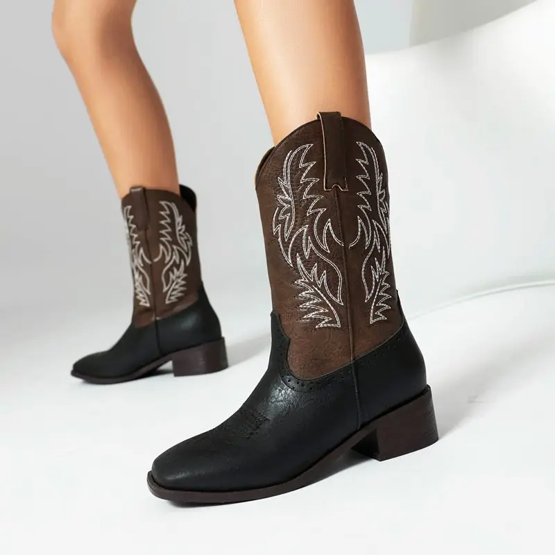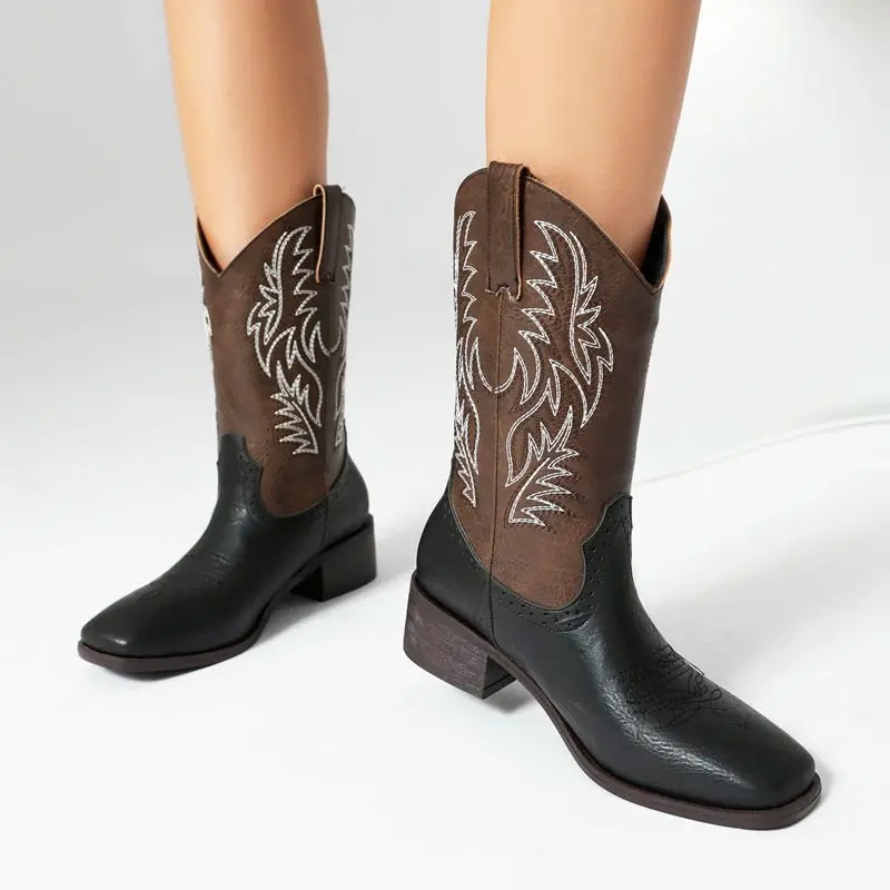 Mixed color western boots with square toe and block heels