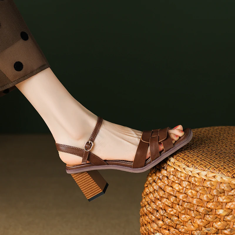 Discover the Elegant Open Toe Chunky Heel Leather Sandals