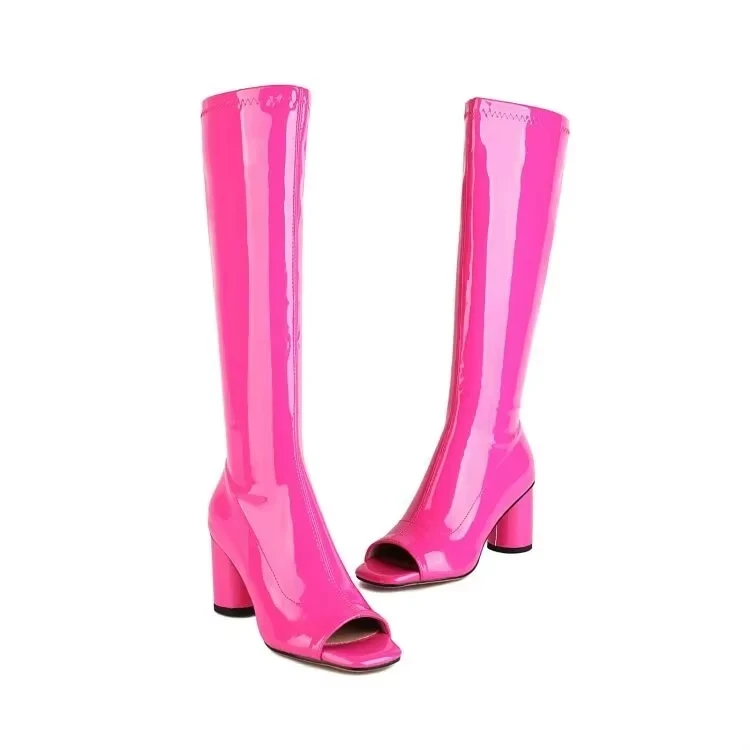 Elevate your footwear collection with the stunning Patent Leather Knee High Peep Toe Boots in a vibrant rose red hue. These boots are designed to enhance your fashion statement while offering comfort and versatility. Perfect for both casual outings and elegant events, they are the ultimate addition to any wardrobe. With their striking appearance and modern design, these boots are sure to turn heads wherever you go.