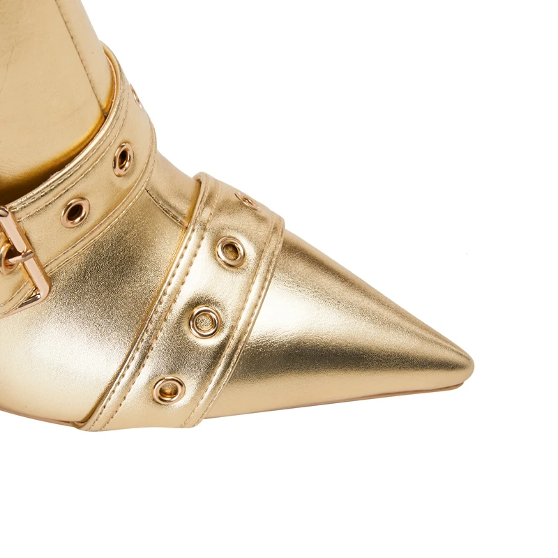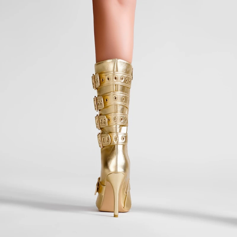 Pointed belt buckle high heel gold large boots