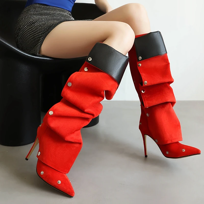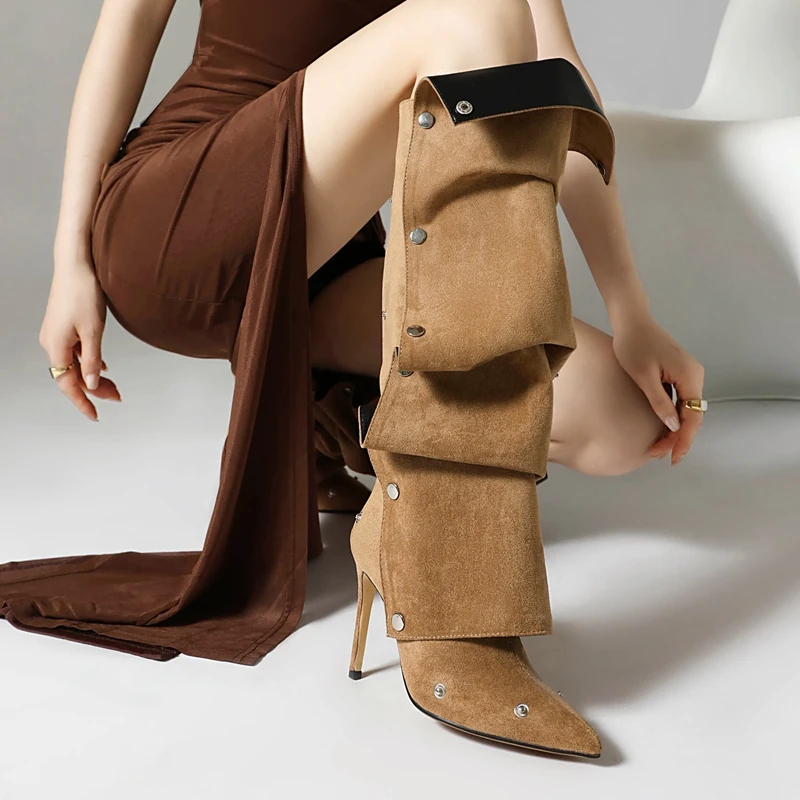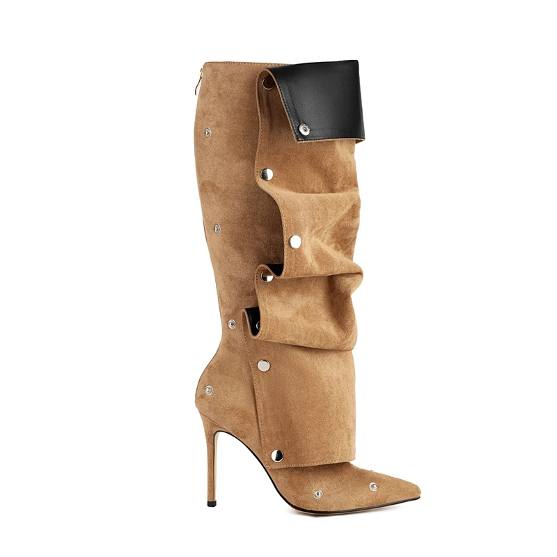 Discover the perfect blend of elegance and modern flair with our stunning Pointed High Heels adorned with Metal Rivets and crafted from luxurious Pleated Velvet. These boots are designed for the fashionable individual who seeks to make a statement while enjoying comfort and durability. Whether you’re dressing up for a night out or adding a chic touch to your everyday ensemble, these high heels are the ultimate choice for any occasion.