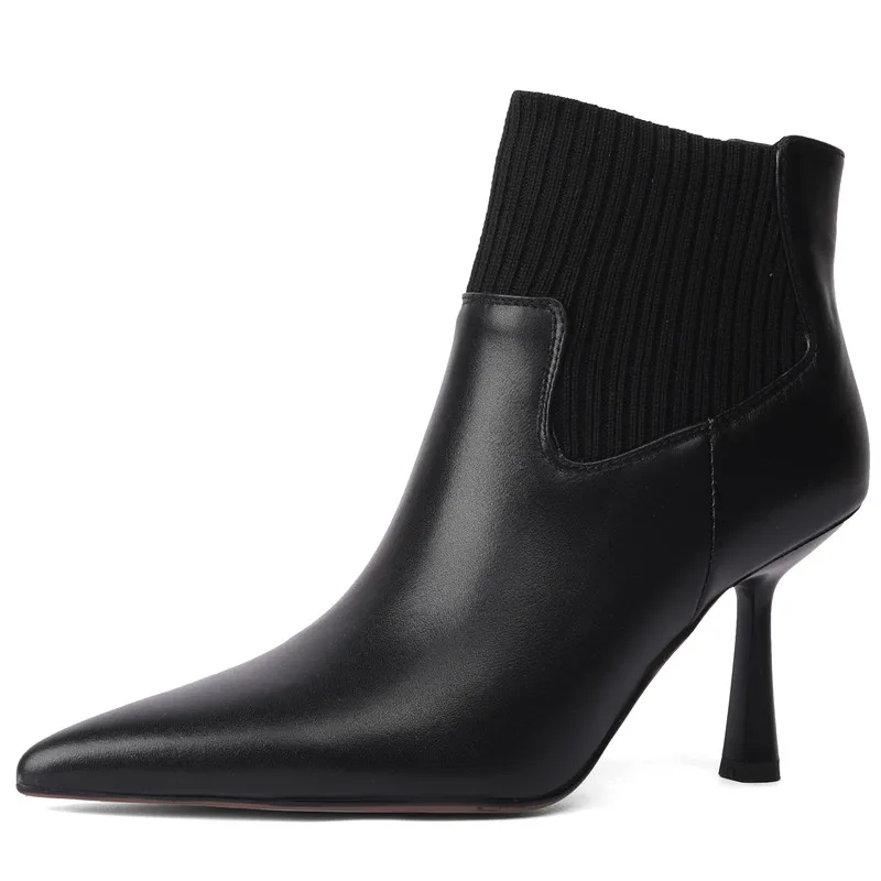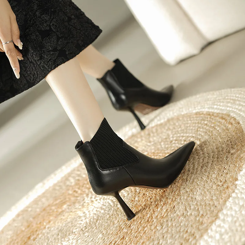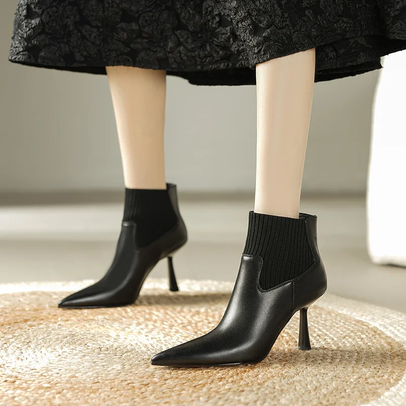 Pointed toe genuine leather ankle boots with high heels