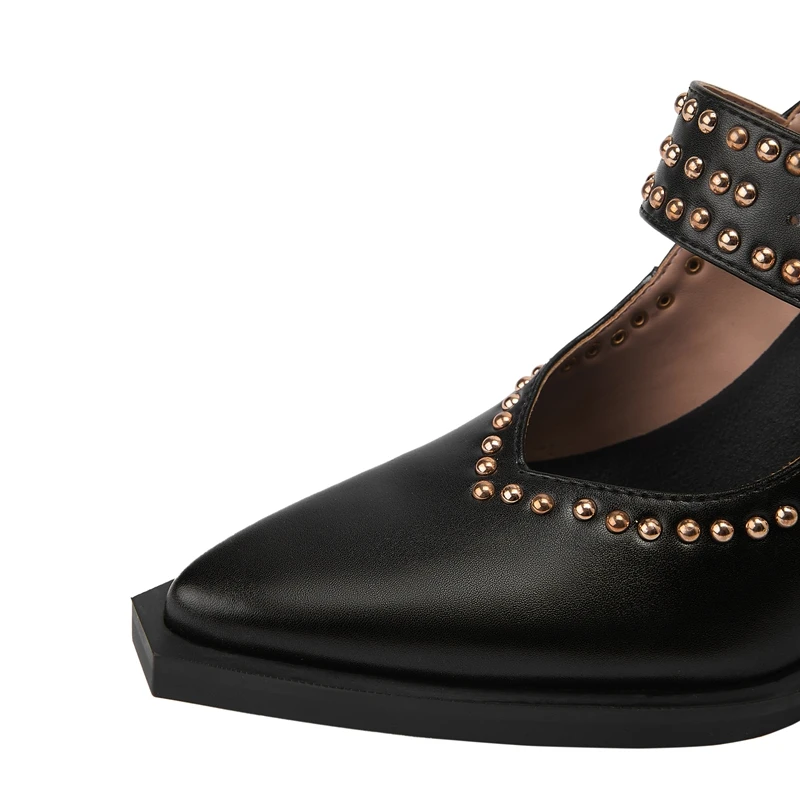 Elevate your style with our exquisite Pointed Toe High Heel Mary Jane Shoes. Designed for the modern woman who appreciates a blend of sophistication and comfort, these shoes are perfect for both casual outings and formal occasions. Featuring striking metal rivets and a chic buckle closure, these shoes not only enhance your outfit but also provide secure support as you step out in confidence.