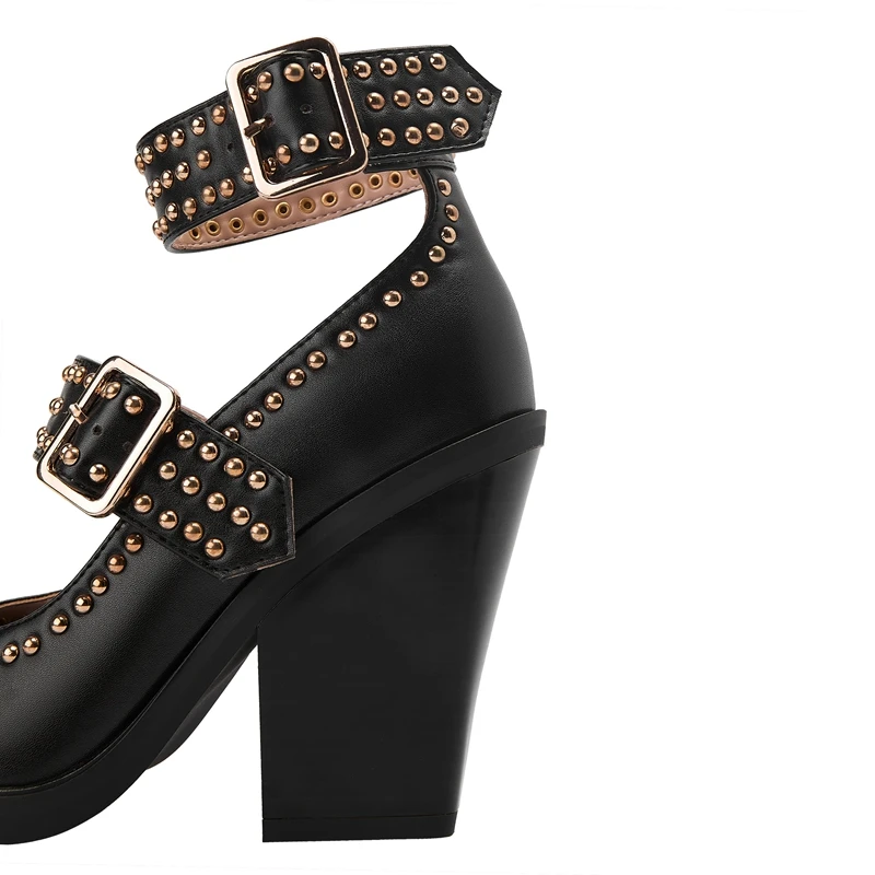 Pointed toe high heel mary jane shoes with metal rivets and buckle