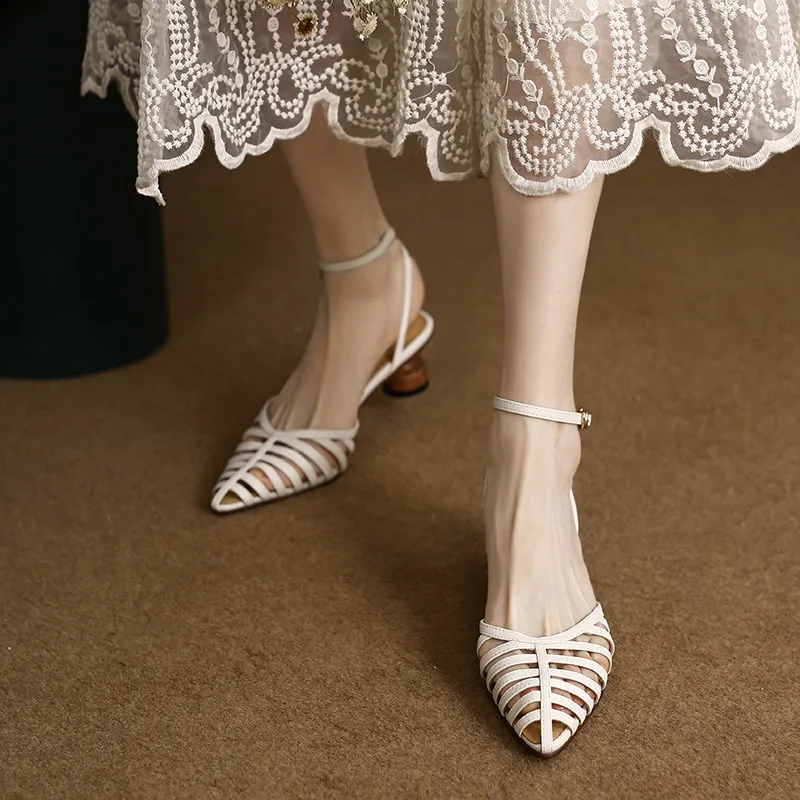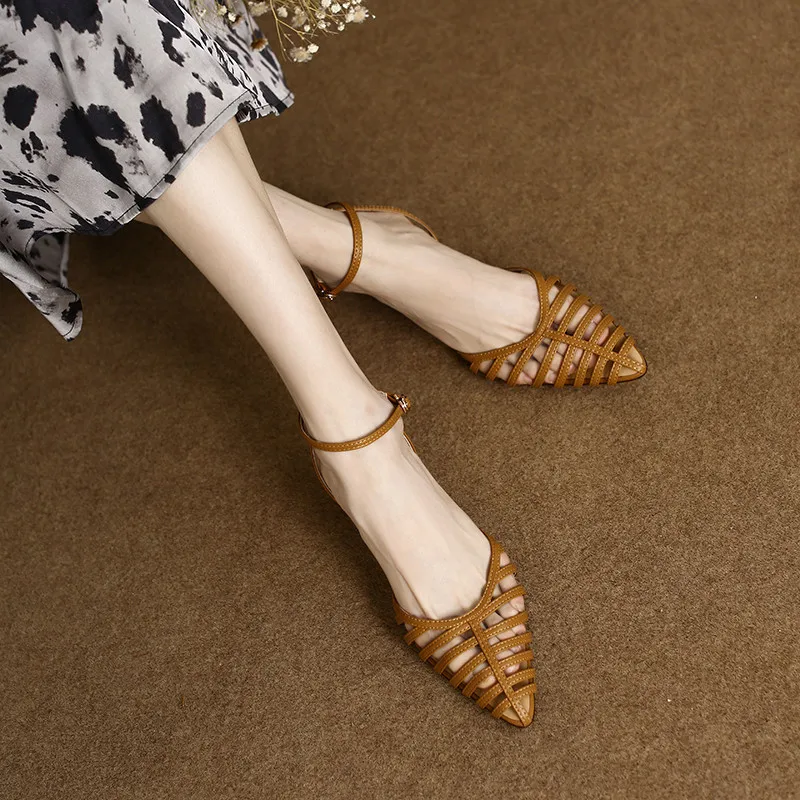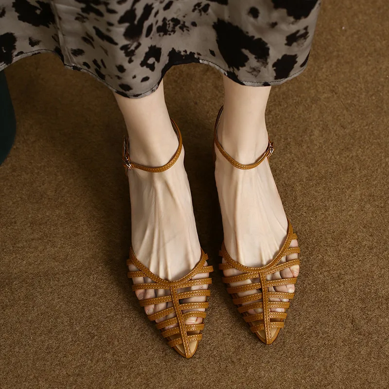 Elevate Your Style with Our Pointed Toe Hollow Leather Ankle Strap Sandals