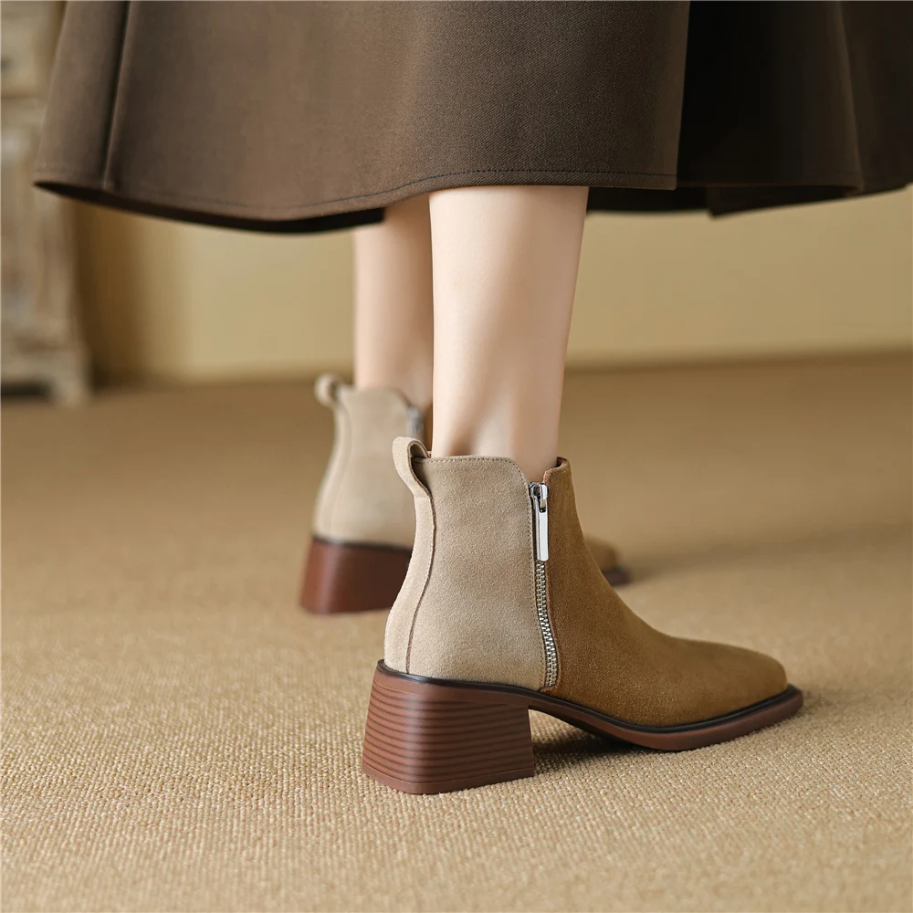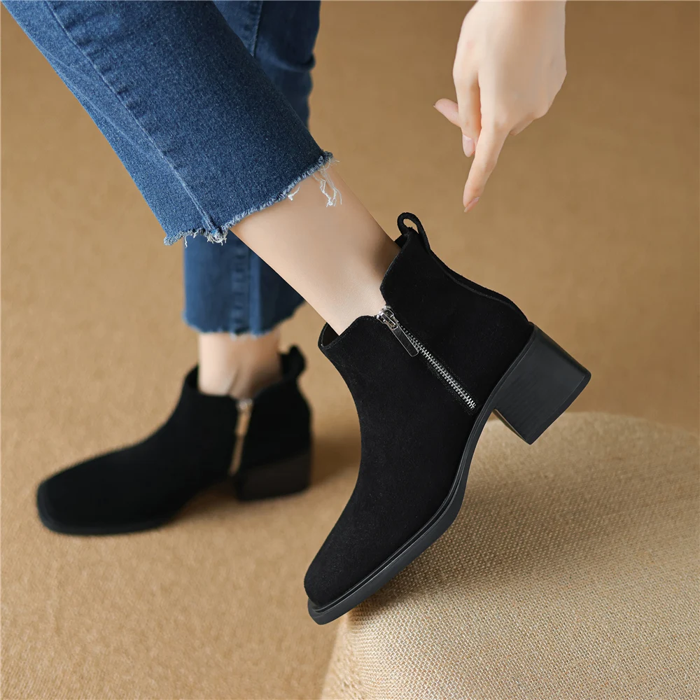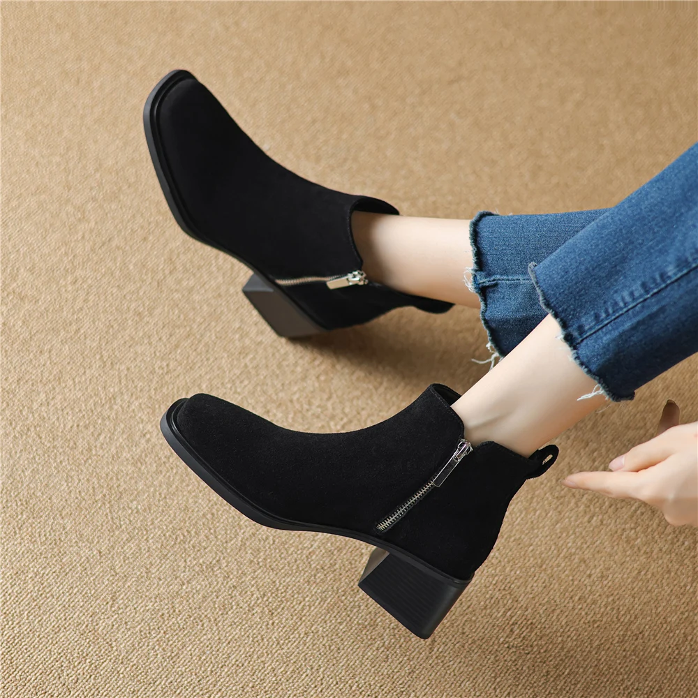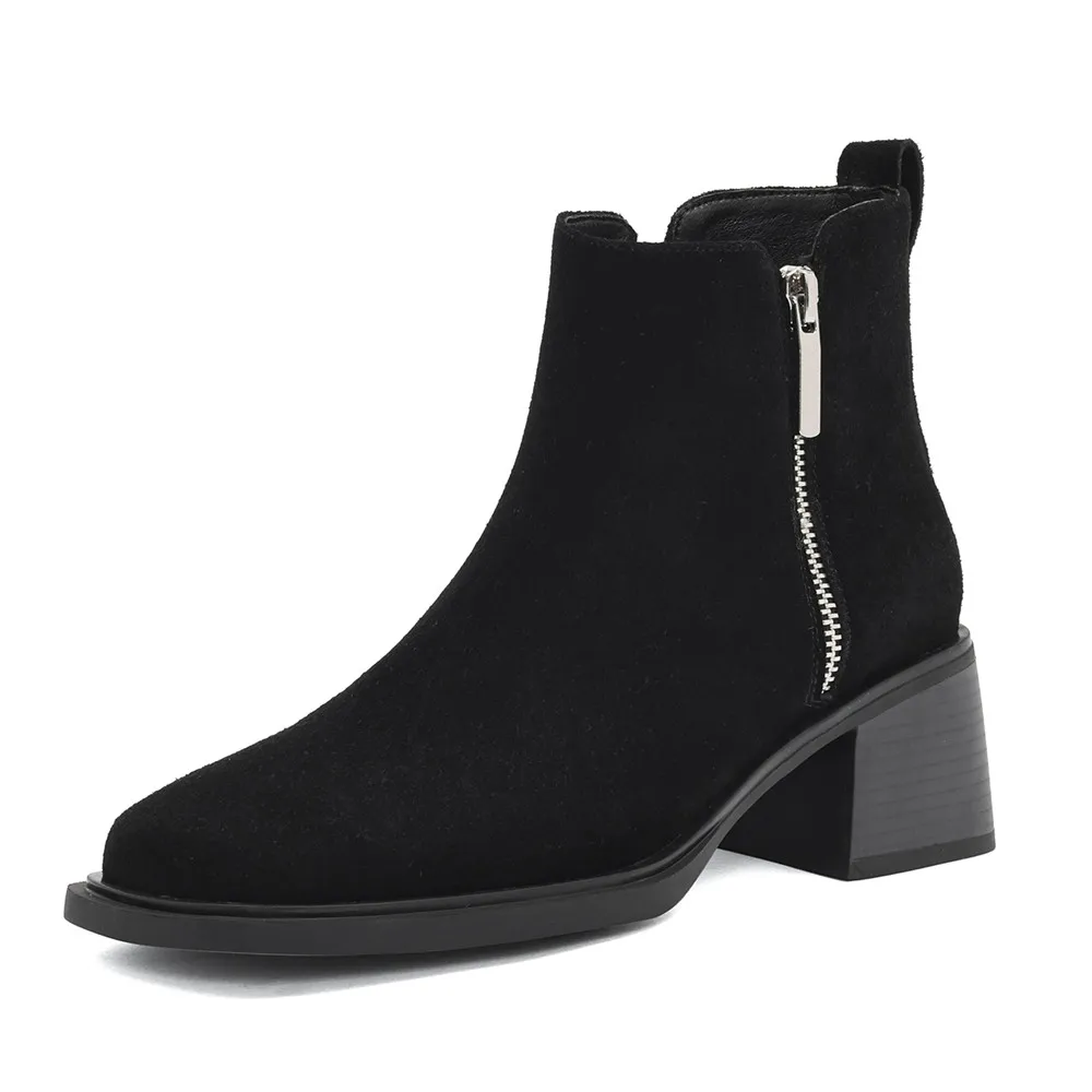 Elevate your footwear collection with our stunning Retro Ankle Boots featuring a chic side zipper and robust thick heels. Designed for the modern trendsetter, these boots blend comfort and vintage flair, making them the perfect addition to your winter wardrobe. Crafted from high-quality cow suede and lined with soft velvet, they ensure your feet stay cozy while turning heads wherever you go.