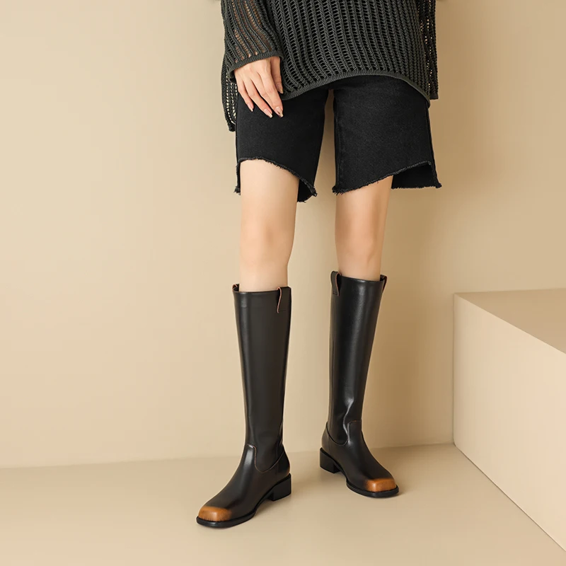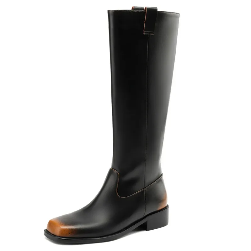Retro genuine leather mixed color knee high boots with square heels