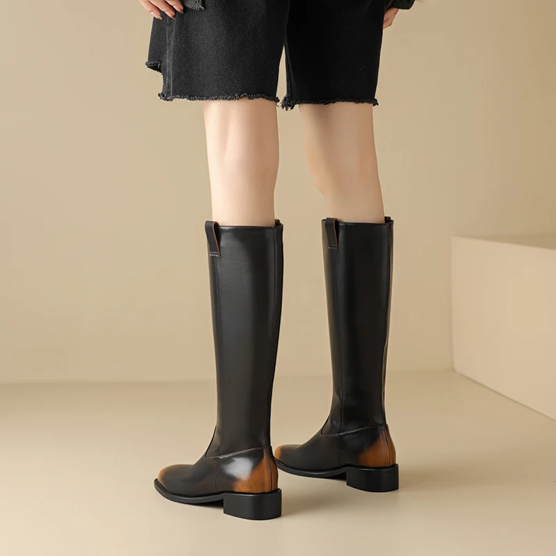 Retro Genuine Leather Mixed Color Knee High Boots with Square Heels