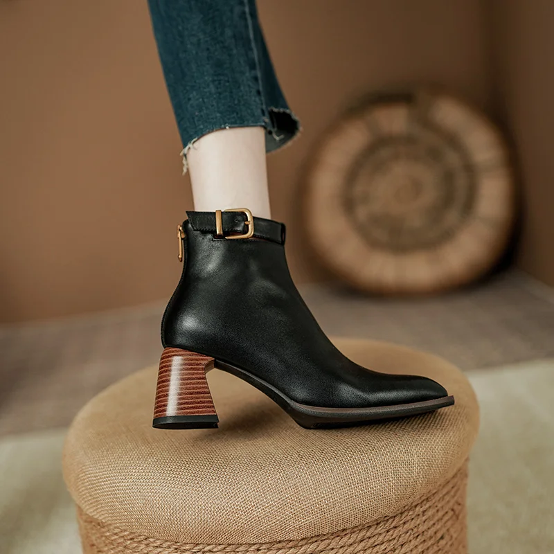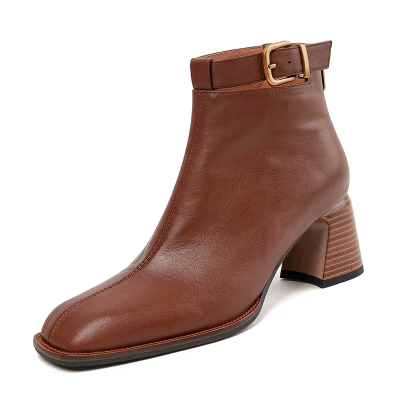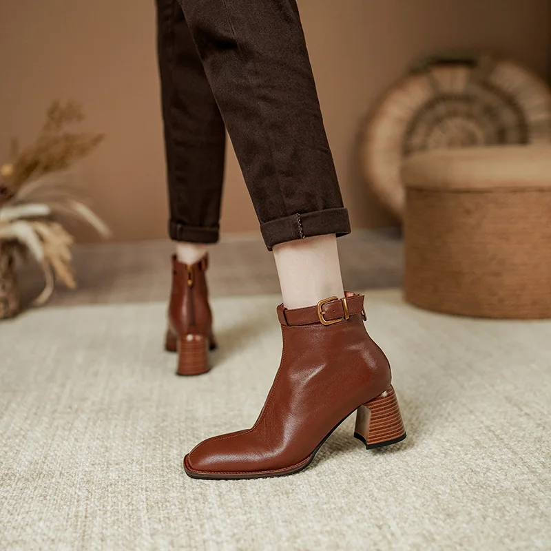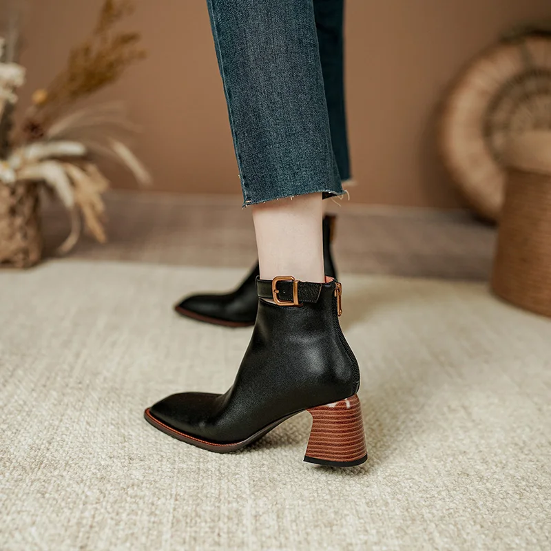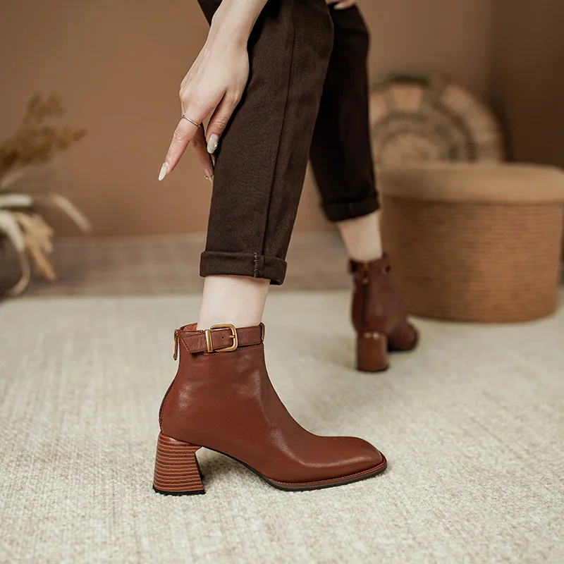 Elevate your footwear collection with our Retro Leather Ankle Boots, designed for the modern individual who values both aesthetics and comfort. Crafted from premium genuine leather, these boots feature a unique design that combines a chunky heel, a square toe, and eye-catching buckle detailing. Perfect for any occasion, from casual outings to more formal events, these boots are a must-have addition to your wardrobe.