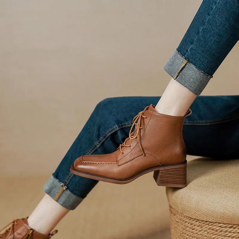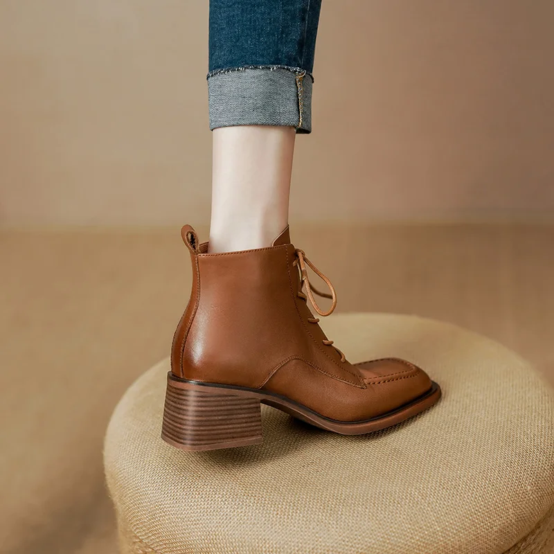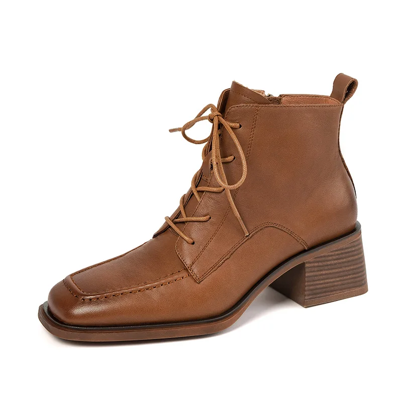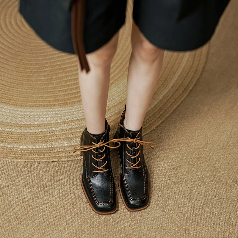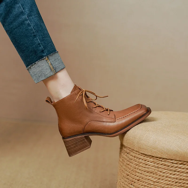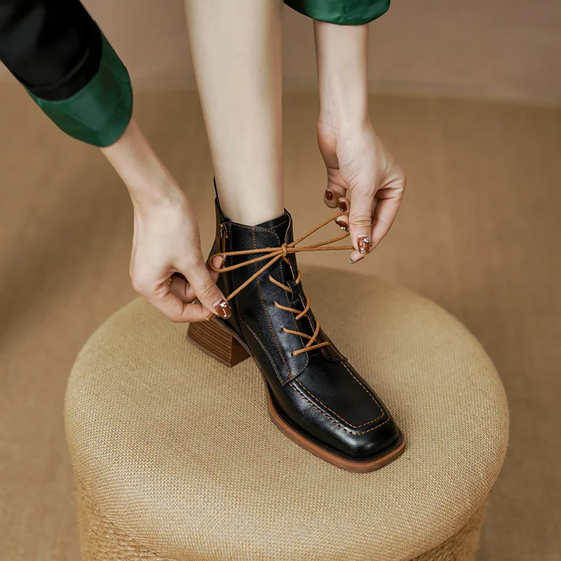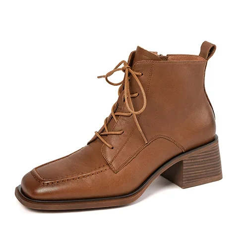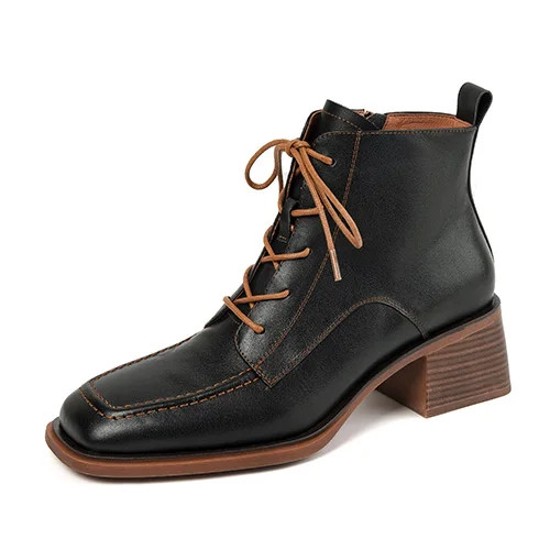 Retro Leather Ankle Boots with Lace Up and Square Heels
